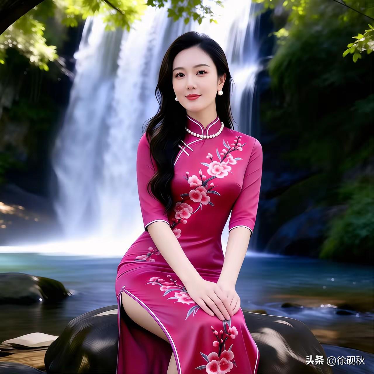 飞瀑凌空挂珠帘, 旗袍佳丽坐石边。