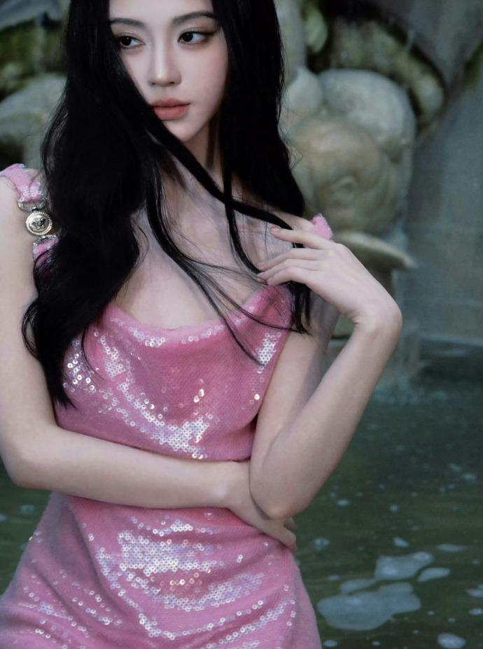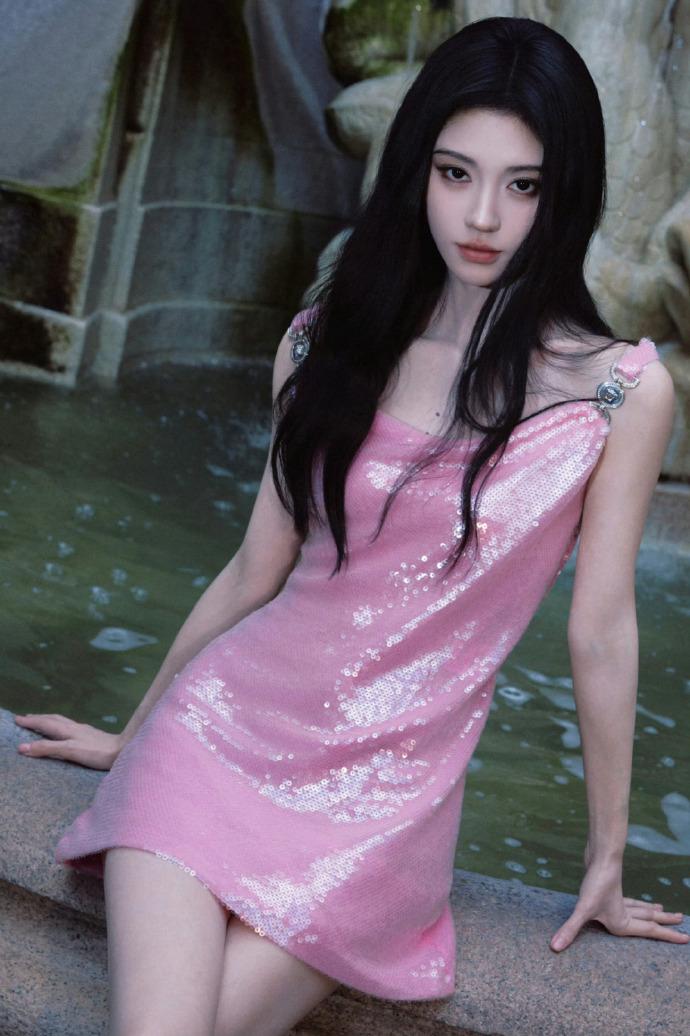 鞠婧祎 喷泉的水纹漫过石沿 像一整池被揉碎的星 她坐在冷硬的边缘 粉色亮片裙,是从夜色里 偷来的一捧碎钻 黑发散在肩后 风把它卷成柔软的浪 指尖掠过发梢时 所有水珠都屏住了呼吸 等她把目光投向镜头 肩带的金属扣 在暮色里闪着冷光 像两枚被遗忘的月亮 她把身体摆成一道弧线 让裙摆的粉 压过石墙的灰 有人在远处按下快门 把这一秒的光 钉进永恒的底片 而她只是轻轻回头 让风掀动衣角 把自己还给流动的水