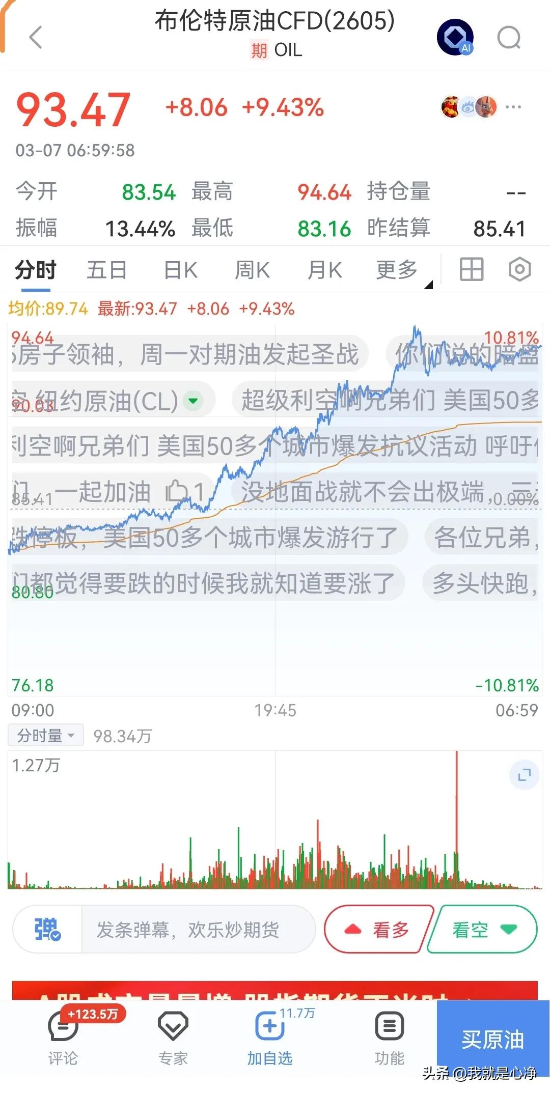 布伦特原油期货价格照这个涨法应该很快就能冲破100,按照之前经济学家们的分析 只要霍尔木兹海峡被堵塞,未来冲到150也不是不可能的 目前霍尔木兹海峡其实处在半封闭的状态,有很多国家冒险强闯,也有很多国家打着中国的旗号骗伊朗当局 目前伊朗的情报机构正在仔细的甄别,强闯的这些船只的真实身份 对美国、欧洲以及以色列的运油船实施精准的打击 但是我们要承认,伊朗的情报能力还是稍微弱一些的,一定会有漏网之鱼冲过去 也一定有很多国家打着中国的旗号,骗伊朗骗过去 所以说半封闭的霍尔木兹海峡,就已经把原油期货的价格冲到将近100了 如果后续伊朗下着狠手,无差别的进攻,那么冲到150就是时间的问题 现在大家不要相信西方媒体炒作的谎言,说什么中国油轮可以平安的度过 伊朗没有说过这个话,因为伊朗知道他们不敢说这个话 伊朗官方从来没有做过这样的承诺,但是他们在执行的过程中,对中国的油轮确实是有照顾 你得提前报备,只要报备身份真实,他们还是能放中国油轮一马的 但是他们绝对不能说这个话,因为一旦说了之后,后续一定会有很多骗子,打着咱们国家的旗号行骗 战争过程中,伊朗官方没有那么强的甄别能力 所以说现在海峡处在半封闭的状态