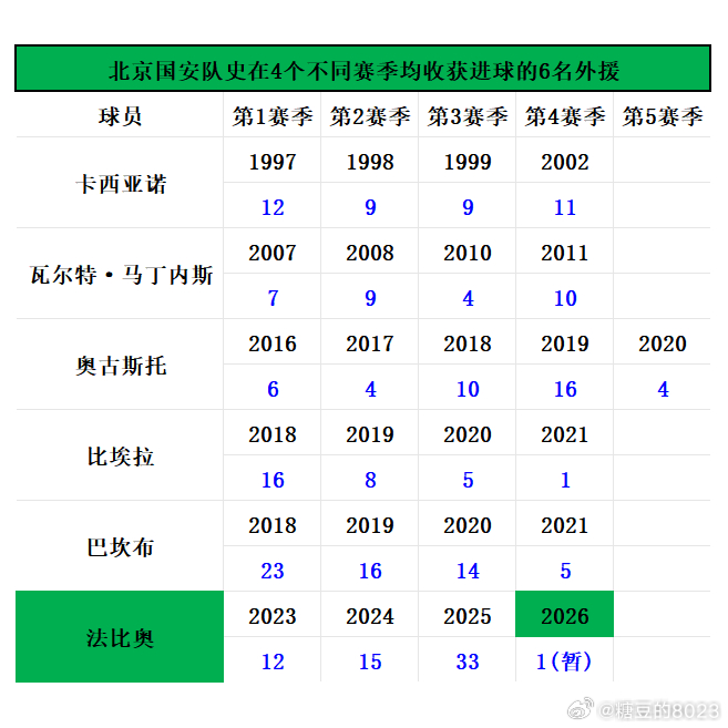 ⚽法比奥成为队史继卡西亚诺、小马丁🕯️、奥古斯托、比埃拉和巴坎布之后,第6位在4个不同赛季为国安进球的外援。【图6】📊强力外援进球分布。