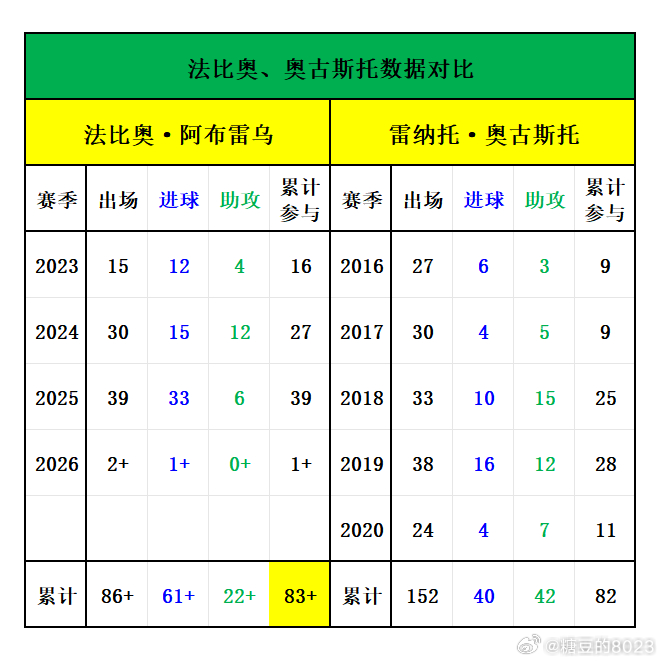 👑此战过后,法比奥国安生涯的数据为61球22助攻,直接参与83球,超越奥古斯托(40球42助攻,参与82球)成为队史参与进球最多的外援。【图7】📊法比奥、奥古斯托数据对比。·