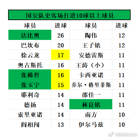 ⚽这是张玉宁代表国安在客场打进的第15粒进球,国内球员位列队史第3,仅次于17球的徐云龙,和16球的张稀哲。【图8】📊国安队史客场10+球球员。·
