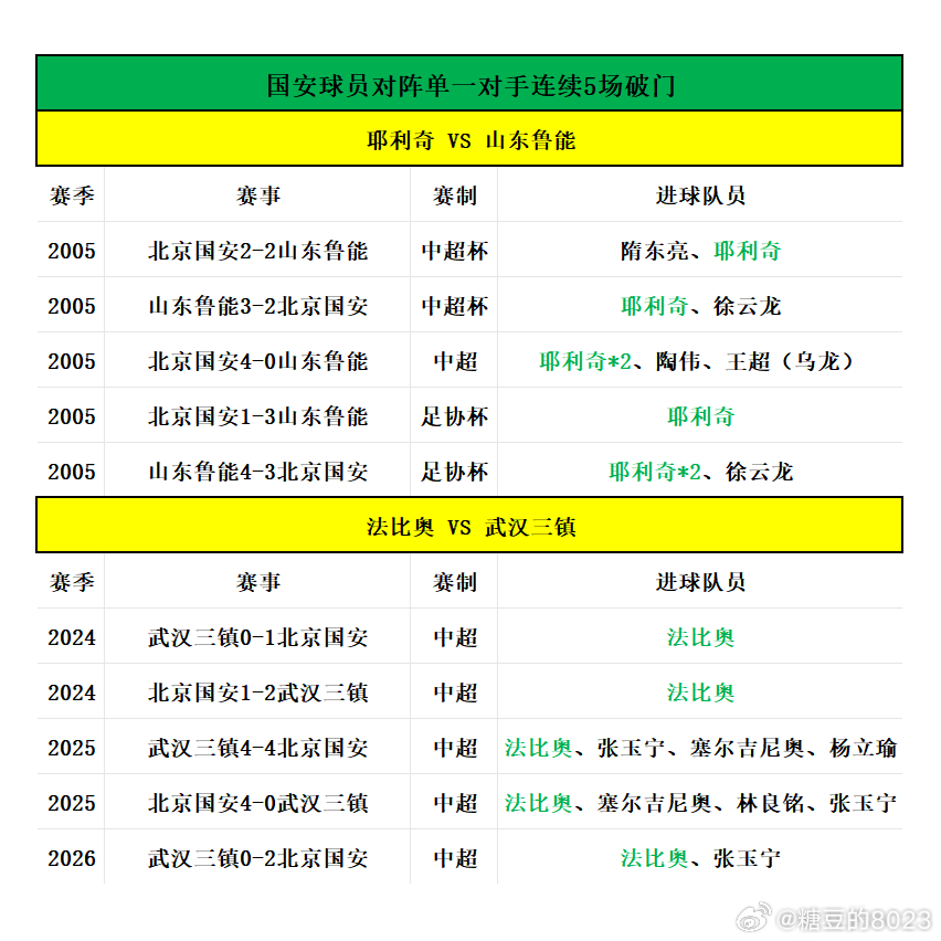 ⚽自2024赛季至今,法比奥连续5场对阵武汉三镇均收获进球,追平了耶利奇对山东鲁能连续5场破门的队史纪录。【图5】📊国安球员VS单一对手连续5场破门。