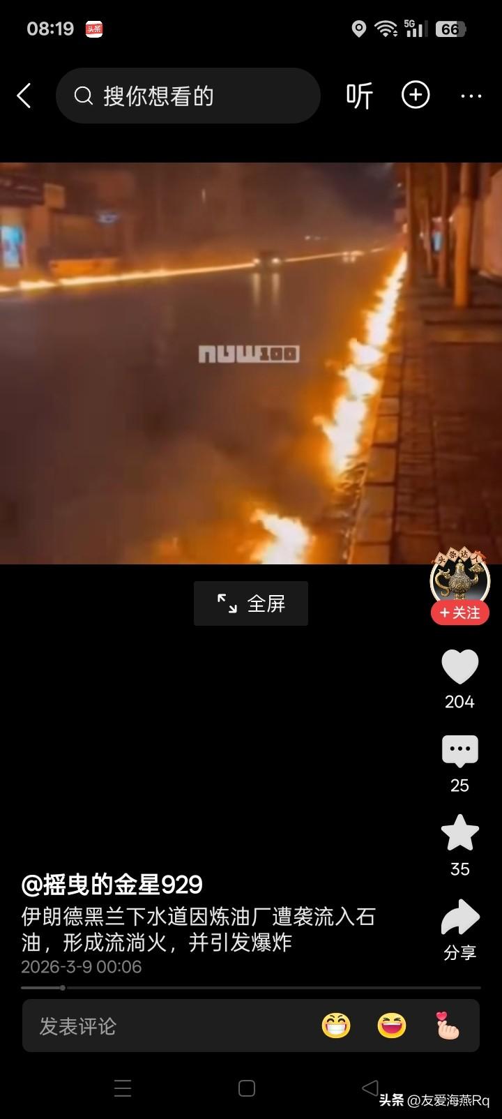 望不到头的火? 3月7日,美国、以色列对伊朗的战争似乎严重升级,当天以色列的战斗机,据传闻说袭击了伊朗德黑兰这个大城市大约30多个燃油仓库。 可以想象一下,如果真的是30多个油库几乎差不多同时爆炸、燃烧,那该是怎样一种骇人听闻的场景。燃油不仅仅是在仓库的废墟中燃烧,肯定还要四处流淌,流到那里,那里很可能就是一片火海。 战争实际上就是破坏,人为的巨大破坏。 下面附图照片二,仅仅是燃油流入德黑兰市街道两边下水道里燃油燃烧的场面,估计这已经足够令人惊心动魄了。