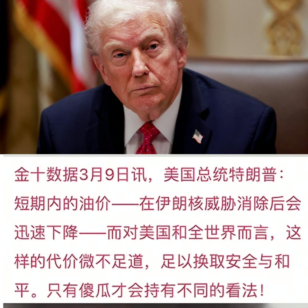 油价狂飙 特朗普终于正面回应了! 记者在空军一号上追问他,会不会动用战略石油储备平抑油价,特朗普明确表态“尚无打算” 。他强调,“我们有大量石油,这个问题很快会得到解决” 。 特朗普直言,自己完全不担心油价上涨,“危机结束后,油价会迅速回落。涨就涨吧,军事行动远比油价小幅上涨重要得多”。他还在社交平台发文称,短期油价上涨是消除伊朗核威胁的“微不足道的代价”,“只有傻瓜才会持不同看法”。 特朗普还不忘踩一脚拜登,说前任把战略石油储备用得差不多了,他不一样,他把“油箱加满了”,会在合适的机会调整。 意思是:我有底气,但现在不是时候。 接下来的油价怎么走?谁也不敢打包票。 这场冲突要持续多久?谁也说不好! 真如特朗普所说的吗? 大家怎么看?