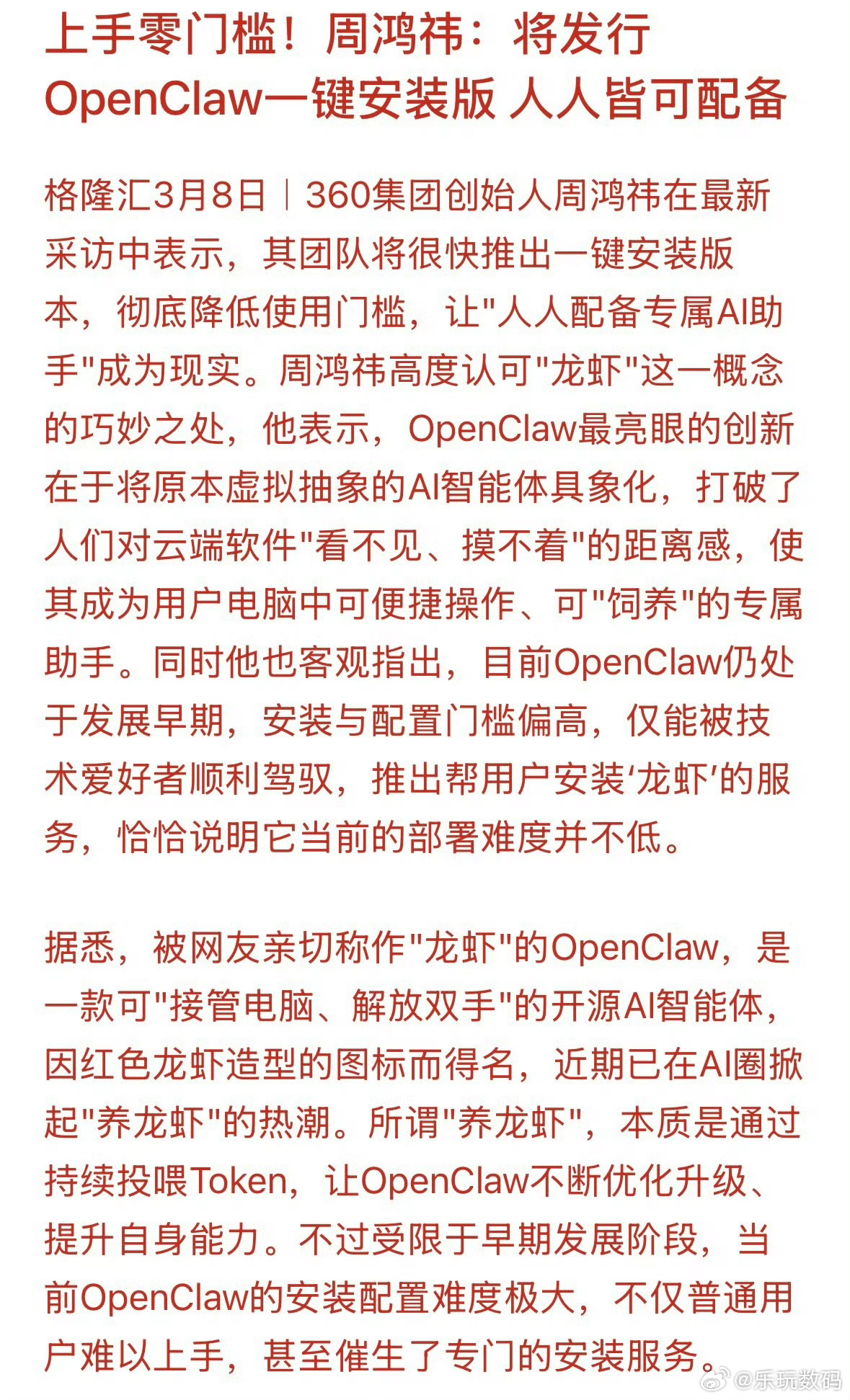 周鸿祎称将发行一键安装的龙虾《周鸿祎:将发行 OpenClaw 一键安装版》网友:填补了AI领域没有牛皮癣的空白。
