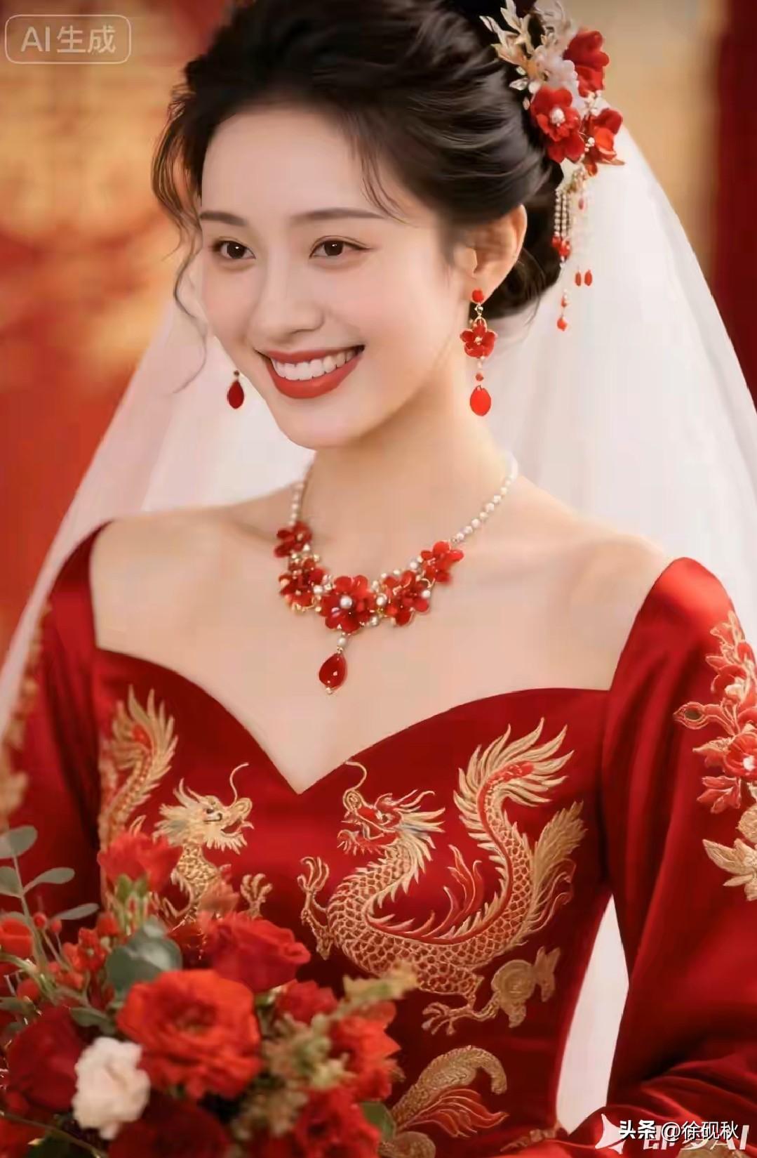美丽新娘,一袭红装。 金龙腾云,眉眼含春。 沉鱼落雁,闭月羞花。 眸若秋水,姹紫嫣红。 千娇百媚,仪态万方 花容月貌,万般风情。 国色天香,国色天香。