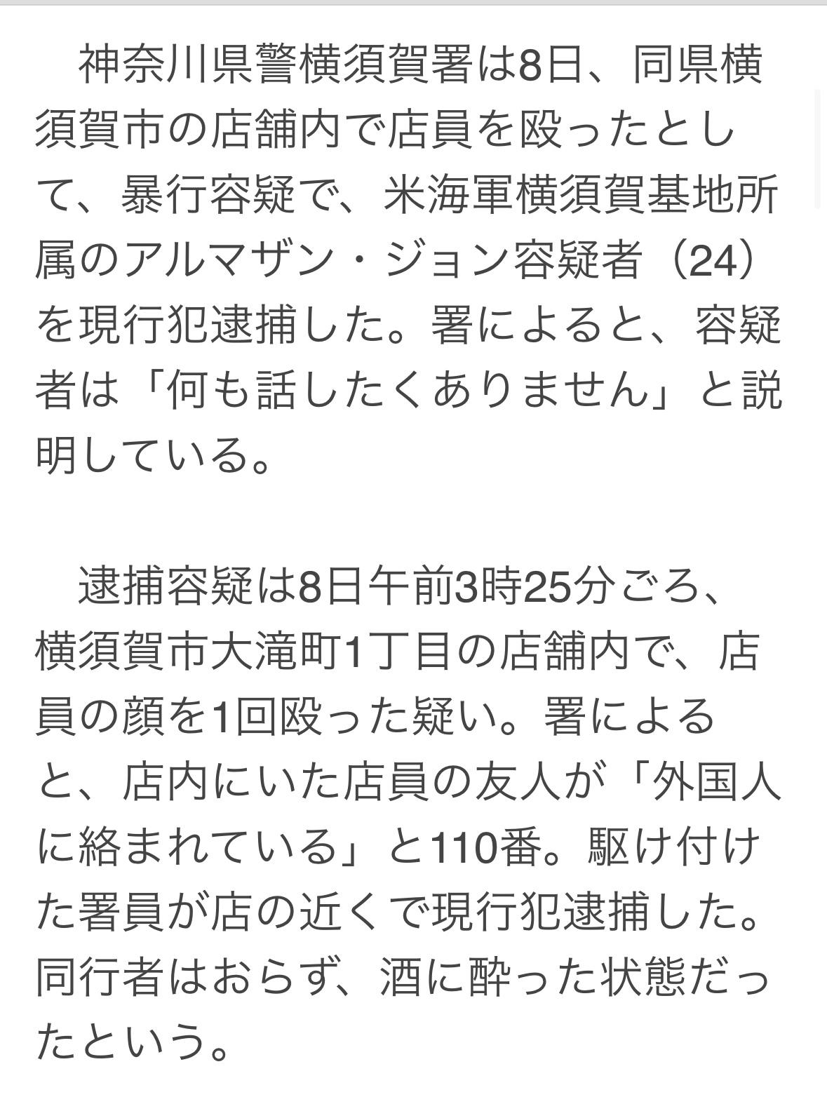 24岁美军阿尔马赞·约翰,8日凌晨3点多,在横须贺市大泷町的商店内,朝店员面部打了一拳。 事发后,店员的朋友报警。称:被外国人骚扰。警察赶到现场,在商店附近逮捕了嫌疑人。嫌疑人当时独自一人,处于醉酒状态。 嫌疑人对警察说:我不想谈任何事。