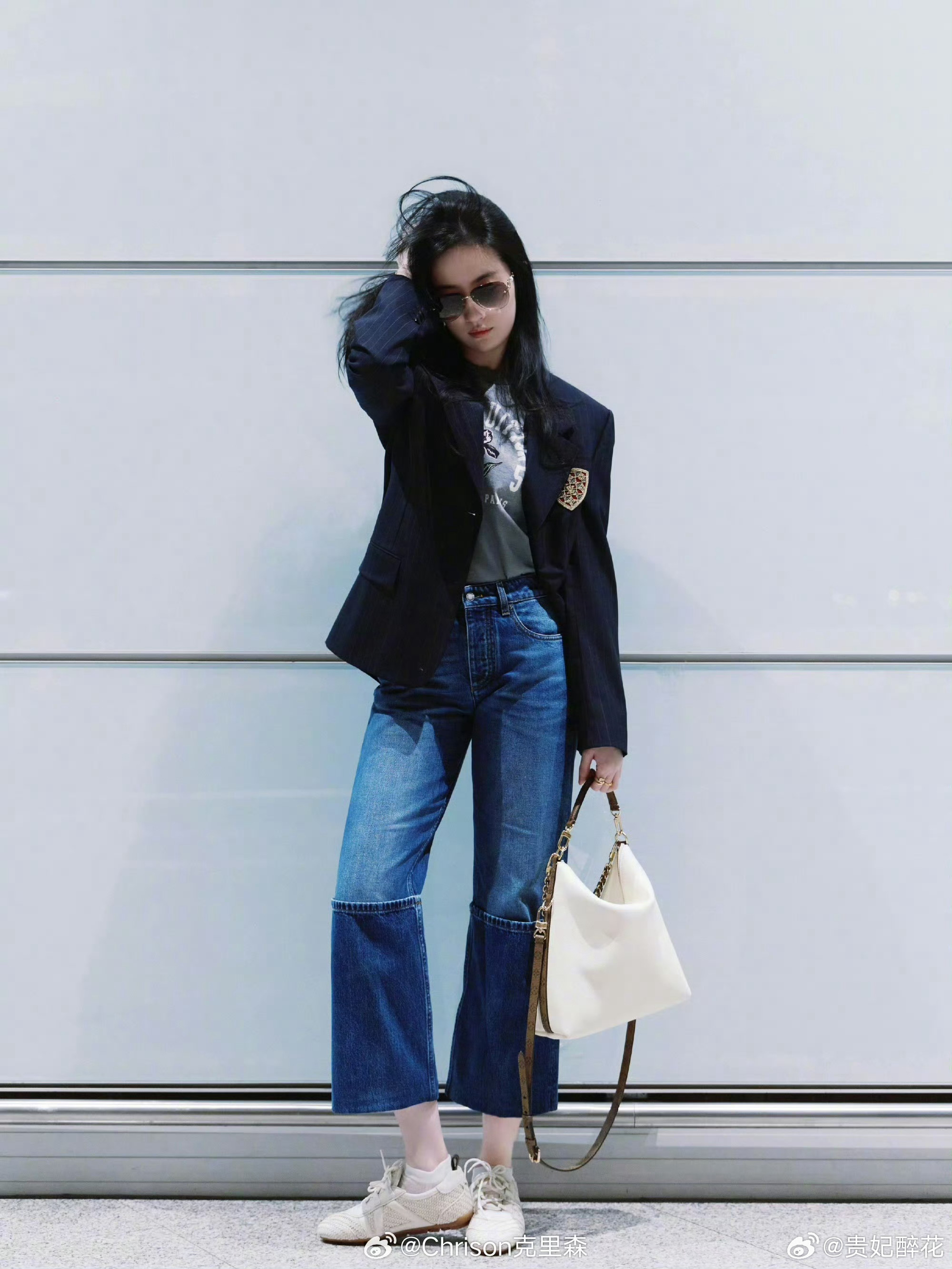 刘亦菲这条裤子挺养生,毕竟降温了肚脐眼必须护住啊