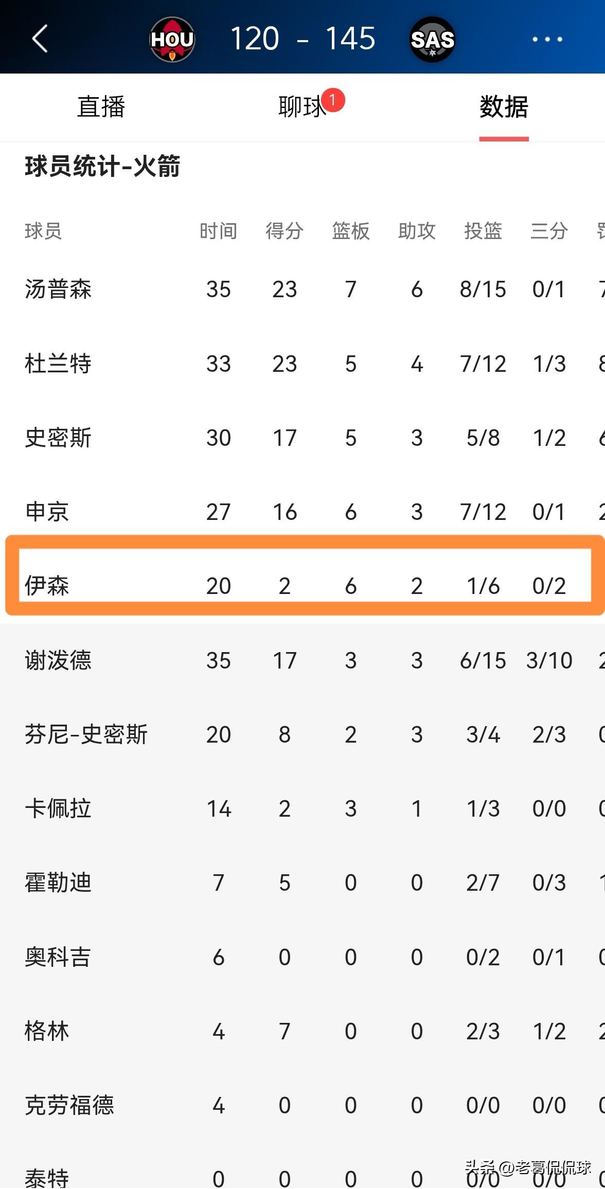 火箭大将伊森真是彻底的废了!在今天火箭客场以120:145输给马刺的比赛中,伊森的表现真是让人失望透顶。 整场比赛下来,伊森首发出战20分钟,投篮6中1,其中三分球2中0仅仅得到可怜的2分,还有4次犯规,他的场上正负值为-20。 实事求是的说,以伊森在本赛季的表现来看,他的大合同已经彻底的泡汤了,火箭不可能在今夏休赛期高薪续约伊森。