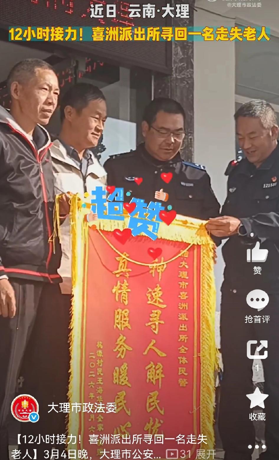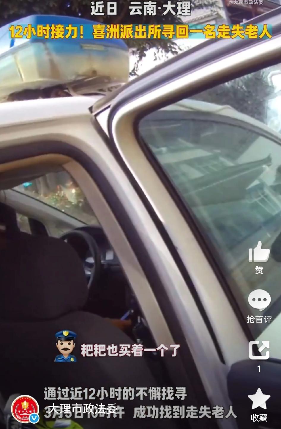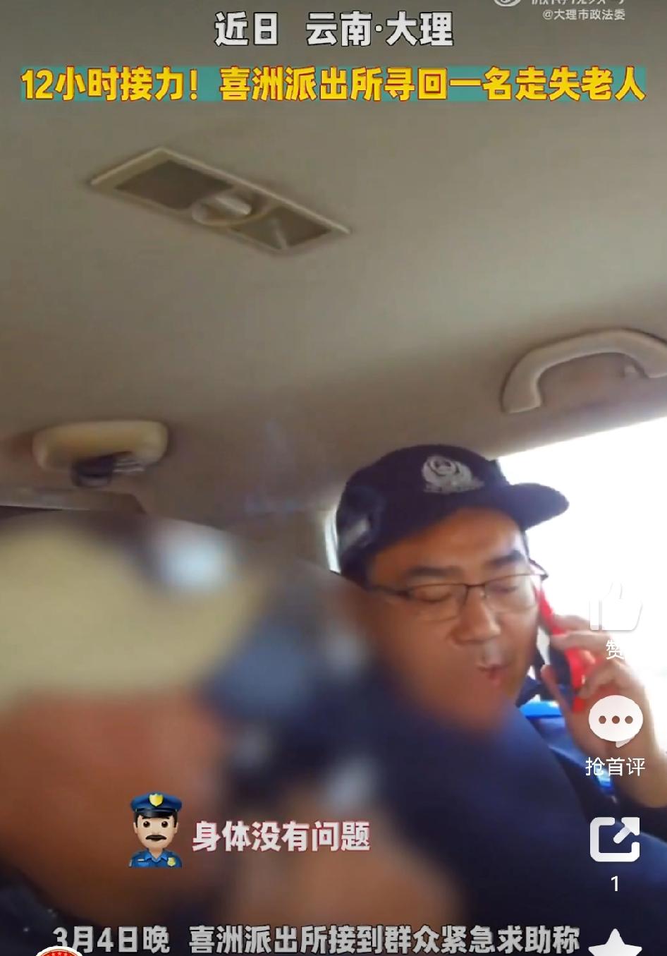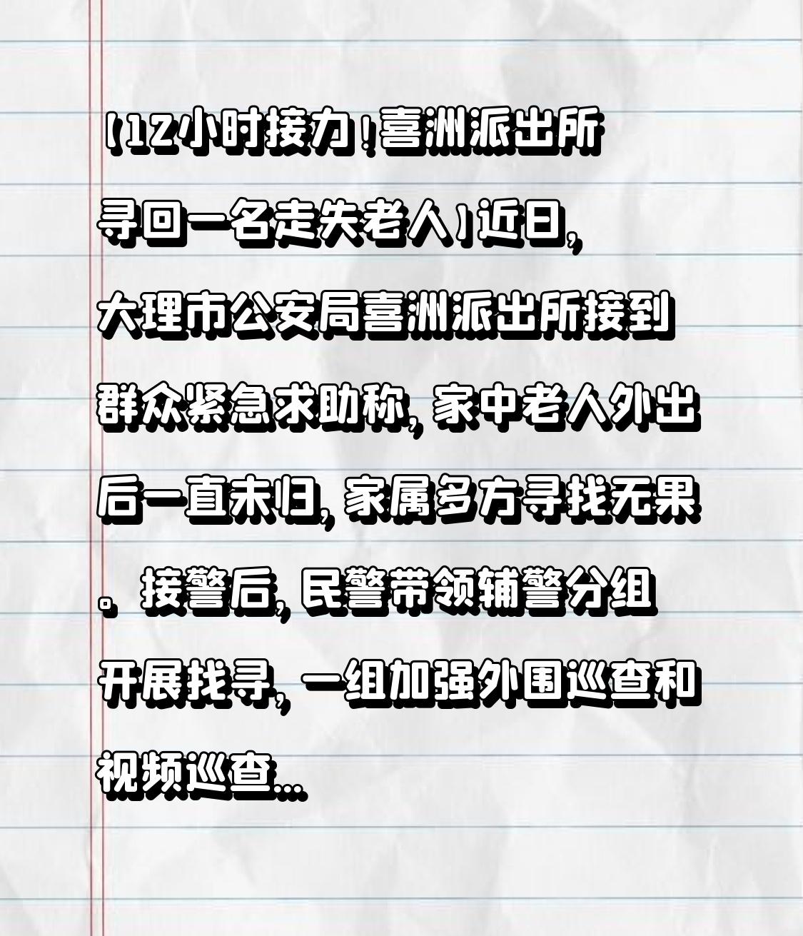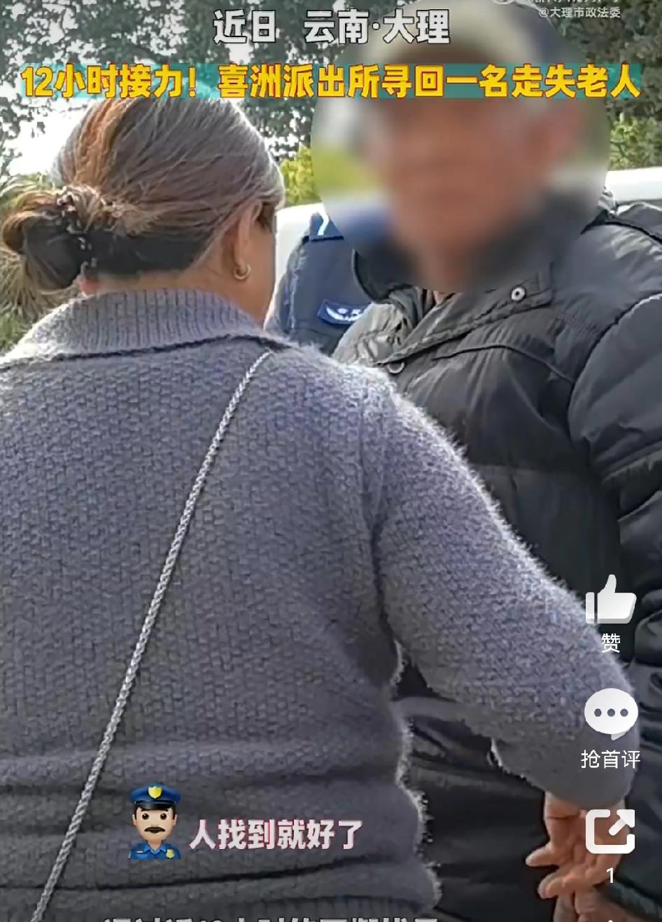 【12小时接力!大理市喜洲派出所寻回走失老人】 近日,大理市公安局喜洲派出所接到群众紧急求助,称家中老人外出后迟迟未归,家属四处寻找均无果。接警之后,民警带领辅警分组展开找寻工作。一组强化外围巡查与视频巡查,另一组则广泛发动村民参与搜寻。经过近12小时的持续找寻,终于成功寻得走失老人。