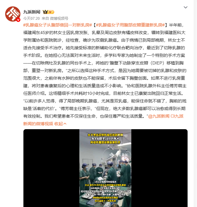 她先接受新辅助化疗联合靶向治疗,临近切除乳腺手术时,多学科专家为其定制方案,同台手术用DIEP移植重塑乳房。10小时精细手术后,林女士康复出院。如今乳腺癌治疗进步,保命与保生活质量不再难两全。