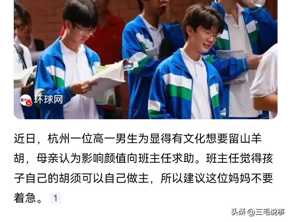 不会吧,有年轻人竟然觉得留山羊胡有智慧? 对于他的这个观点,我真的是醉了。 3月9日热搜,高一儿子想留山羊胡,妈妈求助班主任。 儿子说山羊胡显得有文化。 老师倒是看得挺开的,觉得孩子的胡子可以自己做主,建议这位母亲不要着急。 既然这小伙子想留,就让他留呗,反正班主任都没意见。 人生难得是能做自己开心的事情。高一儿子想留山羊胡 妈妈求助班主任