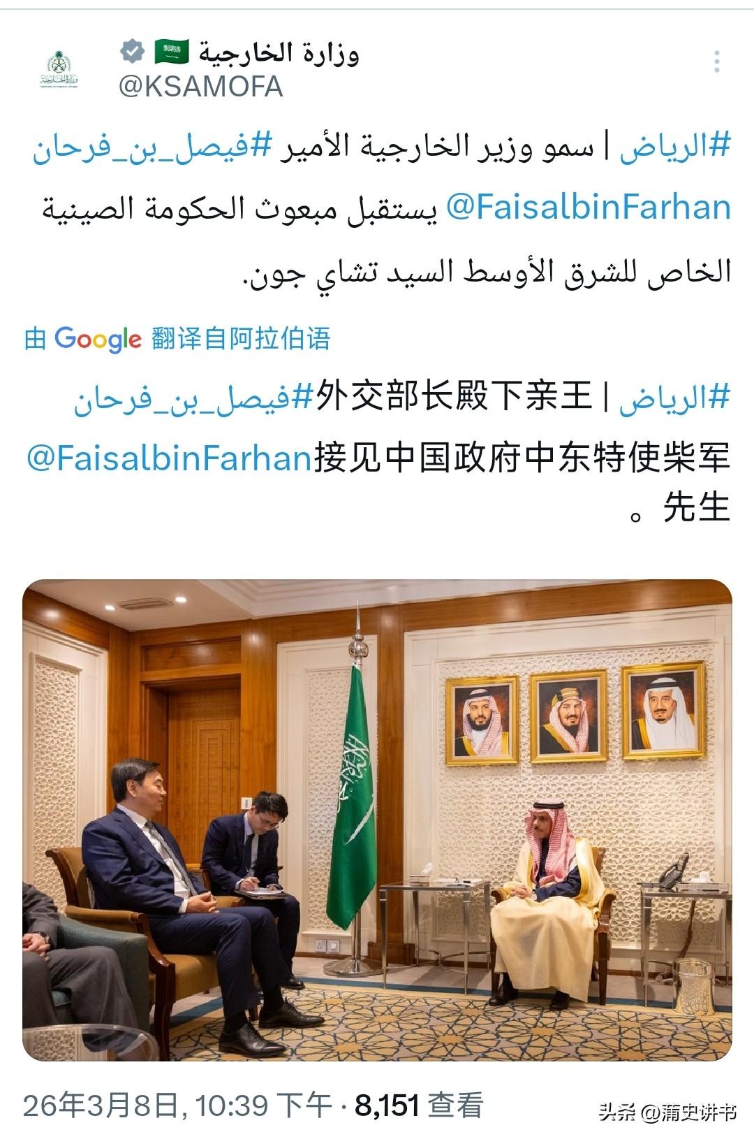 突发!中国特使到访沙特,美以伊冲突中,中方终于亮明立场 3月8日晚,沙特官方媒体传来消息,沙特外交大臣费萨尔亲王,会见了到访的中国中东问题特使翟隽。这一见面瞬间引发关注,大家最关心的是,中国要在美以伊冲突中,发挥什么样的作用。其实早在前几天,中方就已经预告了这轮穿梭外交 从目前的情况来看,沙特应该就是这趟外交行程的第一站。之所以先去沙特,其实也很好理解。现在中东正处于战争状态,去伊朗或者以色列确实不安全,也不现实。而且沙特是海湾地区的领头羊,先和沙特沟通,后续的工作会更顺利 很多人好奇,中方这轮穿梭外交,能改变美以的战略想法吗?说实话,大概率是不能的,毕竟美以的态度一直很坚决。中方这轮行动的核心目标,其实是防止战火进一步蔓延 最关键的就是让海湾国家和伊朗,保持“斗而不破”的状态,不发生直接冲突。这既是最现实的目标,也符合中国和整个中东地区的利益。简单说,中方更像是一个“传话人”,协调好伊朗和海湾国家的关系 所以访问完沙特之后,翟隽特使大概率还会去其他海湾国家。尤其是那些在本轮冲突中,受打击比较严重的国家,比如阿联酋、巴林等。与此同时,中方也会通过外交渠道,和伊朗方面保持沟通。 一方面推动双方降温止损,另一方面也劝说海湾国家,别让美国用自己的基地打伊朗 除此之外,中方这轮穿梭外交还有一个重要目的。今年北京要举办第二届中国阿拉伯国家峰会,还有中国海湾国家峰会。这是中国和中东国家今年的重要外交活动,中方自然希望战争能尽快结束。 这样才能确保峰会顺利举办,不影响中国和中东国家的合作大局 毕竟中方一直秉持公正立场,不拱火、不选边,只想推动和平。大家觉得,中方的这轮穿梭外交,能成功推动局势降温吗?评论区聊聊你的看法 官方信源:央视新闻、中华人民共和国外交部、沙特官方媒体(2026年3月8日-9日相关报道)