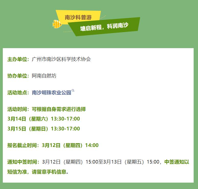 【南沙免费活动】南沙科普又有一个好玩的免费活动来了!广州市南沙区科学技术协会联合阿南自然坊开展南沙科普游系列——“塘启新程,科润南沙”干塘节科普研学活动。本次活动免费报名,共设两场,每场随机选定50组6岁以上的亲子家庭参加!活动地点设在南沙明珠农业公园,孩子和家长可以参加百人抓鱼活动,穿戴专业鱼裤装备,一脚踩进松软塘泥,下塘徒手捉鱼,感受丰收的快乐! 有兴趣参与的,可以关注【南沙科普】报名参加哦! PS:活动是摇号的,中签会收到短信提醒!