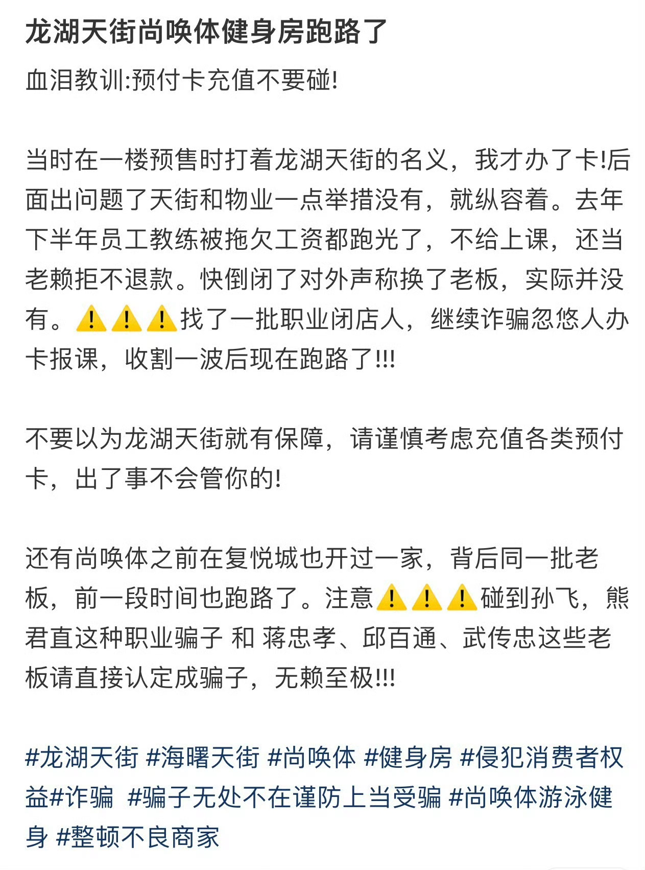 宁波一龙湖天街内健身房闭店消费者难维权 网友莫气“moqi”发帖维权:龙湖天街尚唤体健身房跑路了血泪教训:预付卡充值不要碰! 当时在一楼预售时打着龙湖天街的名义,我才办了卡!后面出问题了天街和物业一点举措没有,就纵容着。去年下半年员工教练被拖欠工资都跑光了,不给上课,还当老赖拒不退款。快倒闭了对外声称换了老板,实际并没有…