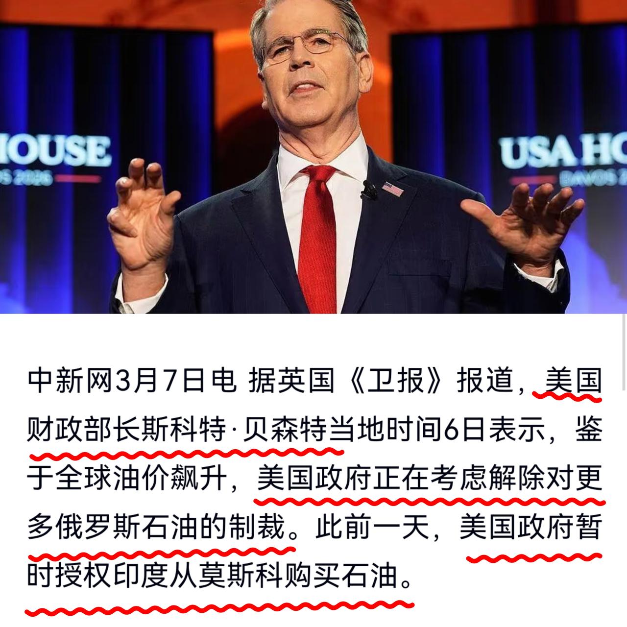 川普绝绝子是普京“真爱粉” 曾几何时,俄罗斯油轮跟做贼似的“躲着开”,现在美国贝森特在采访里明确释放信号:可能进一步豁免俄罗斯原油制裁。 这意味那数亿桶被“冻结”的俄罗斯原油,随时能“解禁入市”。 因为美伊冲突,西方对俄能源制裁被战争彻底瓦解了。谁是最大受益者? ——咱们北面邻居 伊朗为啥能拿到那么精准的打击坐标? 只要中东持续紧张,海上那些以“幽灵船”模式游荡的俄油,就不止是“解除制裁”那么简单,更是会被全球买家“抢着买”。 以前俄油得打折卖,还得偷偷摸摸找地方交货。 现在好了,不仅能光明正大交易,还能“溢价卖”。就算比WTI原油110美元的价格稍低一点,那也是相当高的价位了。 所以这场能源博弈短期内根本停不下来,就冲俄罗斯这波能赚的钱,它能轻易收手吗? 要是从这波红利里抽点“提成”给伊朗,伊朗沙漠里那些“稀奇古怪”的武器、还有精准打击的坐标,只会越来越多。 乌克兰的泽连斯基不还要“请一个月假”支援中东吗?估计普京能给他假! 大家怎么看,欢迎评论区聊聊!