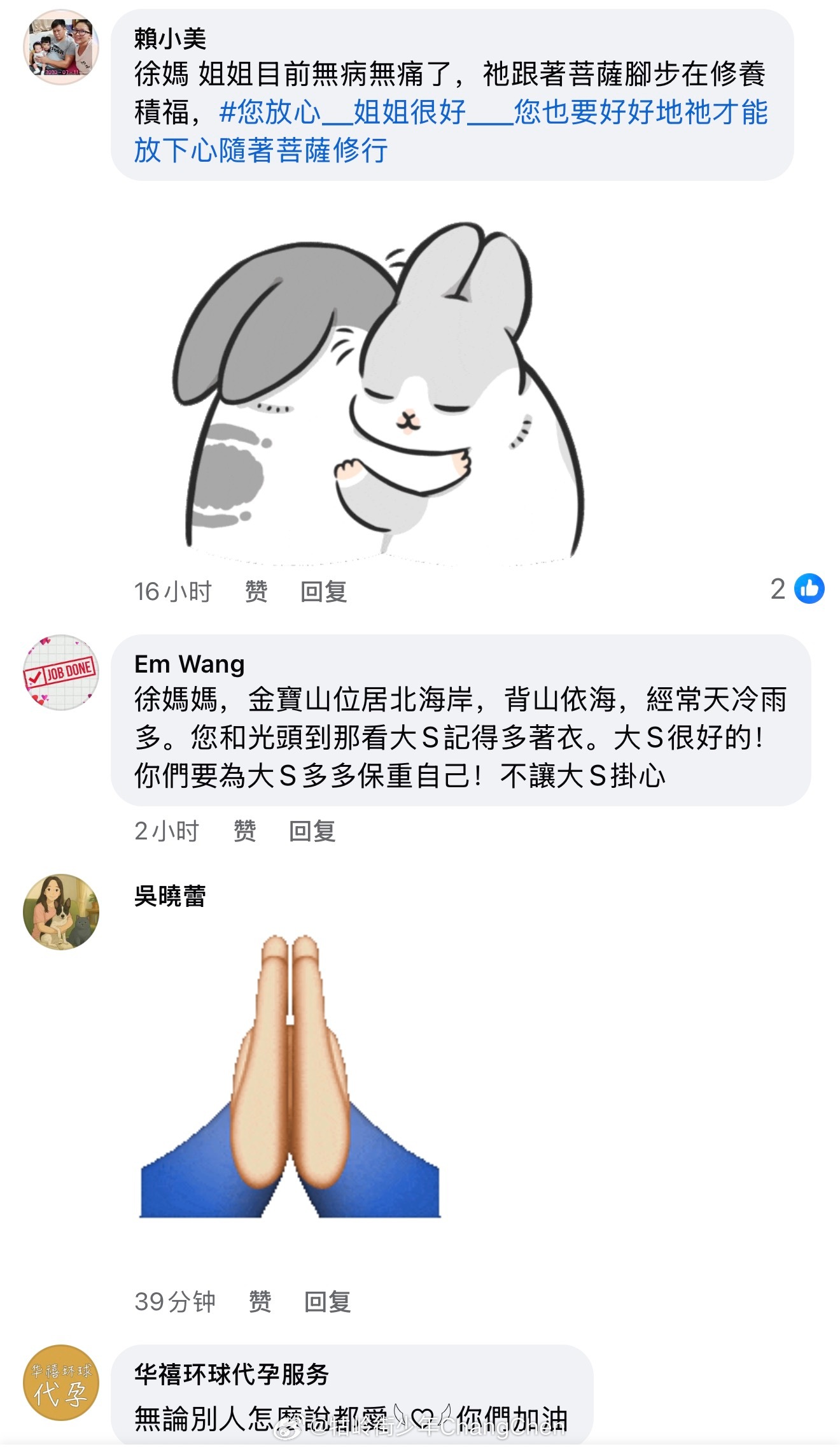 大S的妈妈黄春梅去墓地看大S了“亲爱的宝贝:台北天气不错,妈妈来金宝山看你,一上山,一片风苦雨,妈妈心中也苦不堪言!幸而有很多爱的粉丝依然来送花,你看,宝贝:阿德(儿子)感冒了一样按时做早餐陪吃,我很感谢他。宝贝:我会盯着孩子健康、平安成长的,爱你。“
