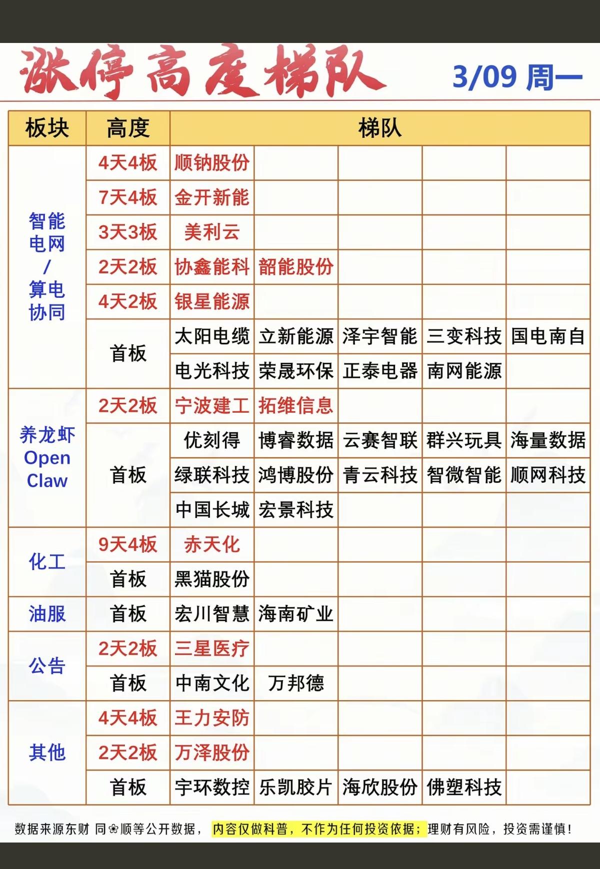 3.9周一 涨停板股票:高度+梯队! 电力电网 15股涨停 OpenClaw 14股涨停 化工原料 2股涨停 油气开采 2股涨停