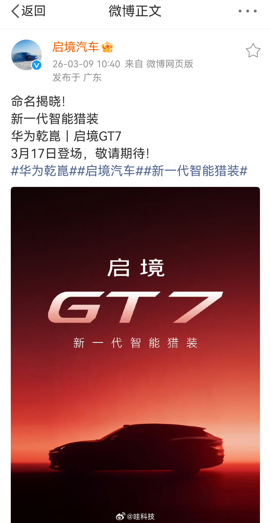 华为乾崑|启境新一代智能猎装正式定名GT7,3月17日即将亮相!这款高端智能猎装座驾直接拉满越级配置,全球量产高规格896线激光雷达带来超精准感知,L3级架构全链路冗余筑牢出行安全,还有HUAWEI XMC 乾崑数字底盘引擎与鸿蒙座舱的双重加持,妥妥的高端配置下放,打造出对标50-70万级车型的硬核产品力。从感知到驾控,从智能到底盘,每一处配置都彰显着极致的产品追求,3月17日,静待这款智能猎装的惊艳登场!华系首款智能猎装车定名启境GT7启境官宣首款车型命名GT7