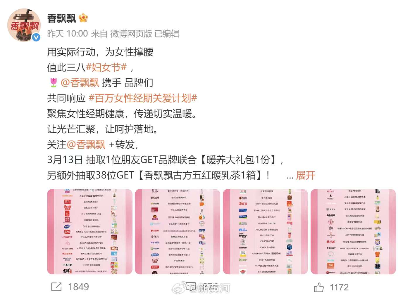 【#百家企业联合呼吁关爱痛经女性#】三八妇女节当天,香飘飘牵头苏菲、苏泊尔等百家知名企业共同发起关爱经期女性倡议刷屏网络,聚焦一个长期被忽视的话题——职场女性的痛经困境。