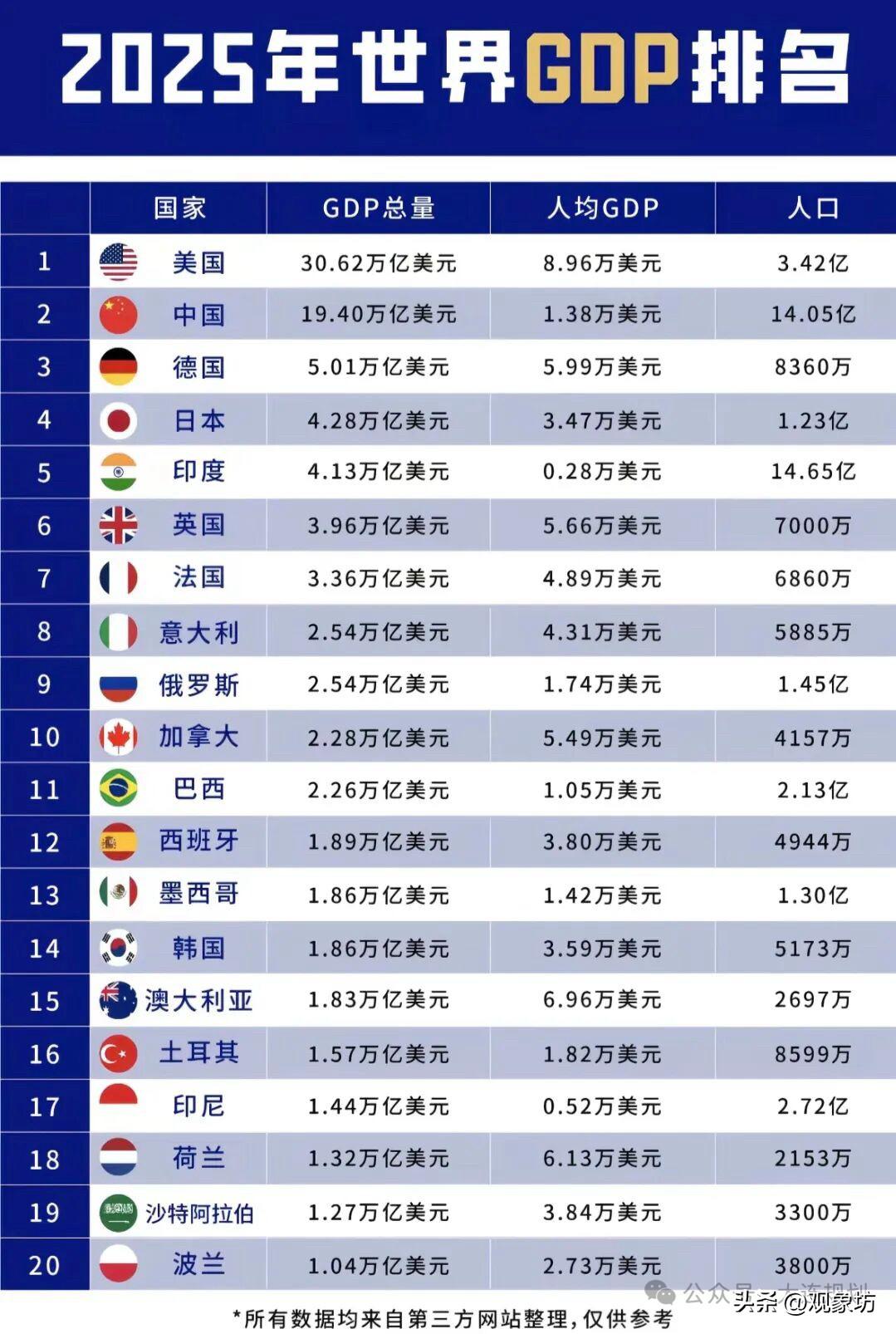 2025全球GDP榜单出炉:中美断层领先,人均才是硬道理 2025年世界经济格局再次洗牌,最新GDP排名显示,美国以30.62万亿美元的总量稳居榜首,中国紧随其后达到19.40万亿美元,两国“双雄并立”的态势愈发明显。德国、日本、印度分列三至五位,全球经济重心依旧稳固。 然而,总量的光鲜未必代表民生的富足。榜单中,澳大利亚、荷兰等人均GDP接近或超过7万美元的国家,虽总量未进前十,但国民富裕程度令人瞩目。反观人口大国印度,虽然总量冲进前五,但人均仅2800美元,发展不平衡问题依然严峻。 对于普通人而言,宏大的数字远不如手中的“钱袋子”实在。GDP总量彰显国家实力,而人均GDP才真正折射生活质感。在关注国家排名的同时,我们更应聚焦于高质量发展的成色,毕竟,让老百姓过上好日子,才是经济增长的终极意义。