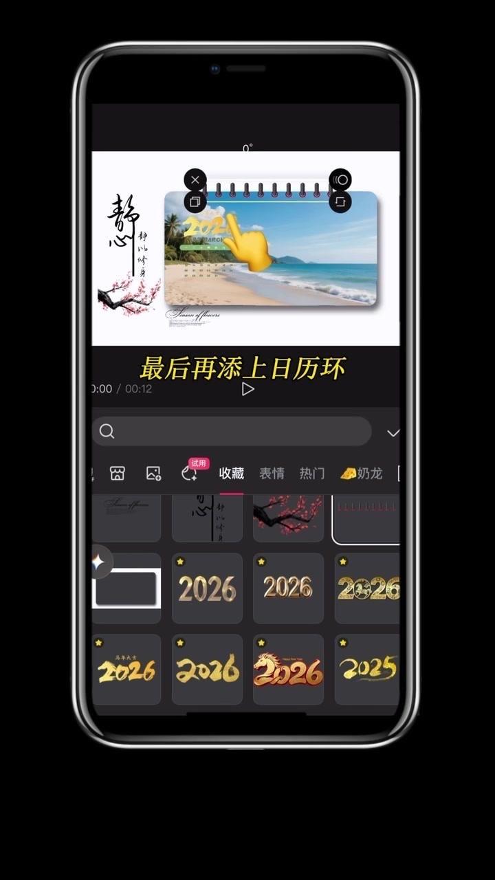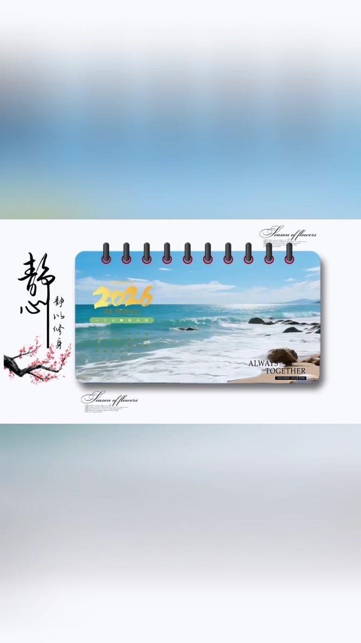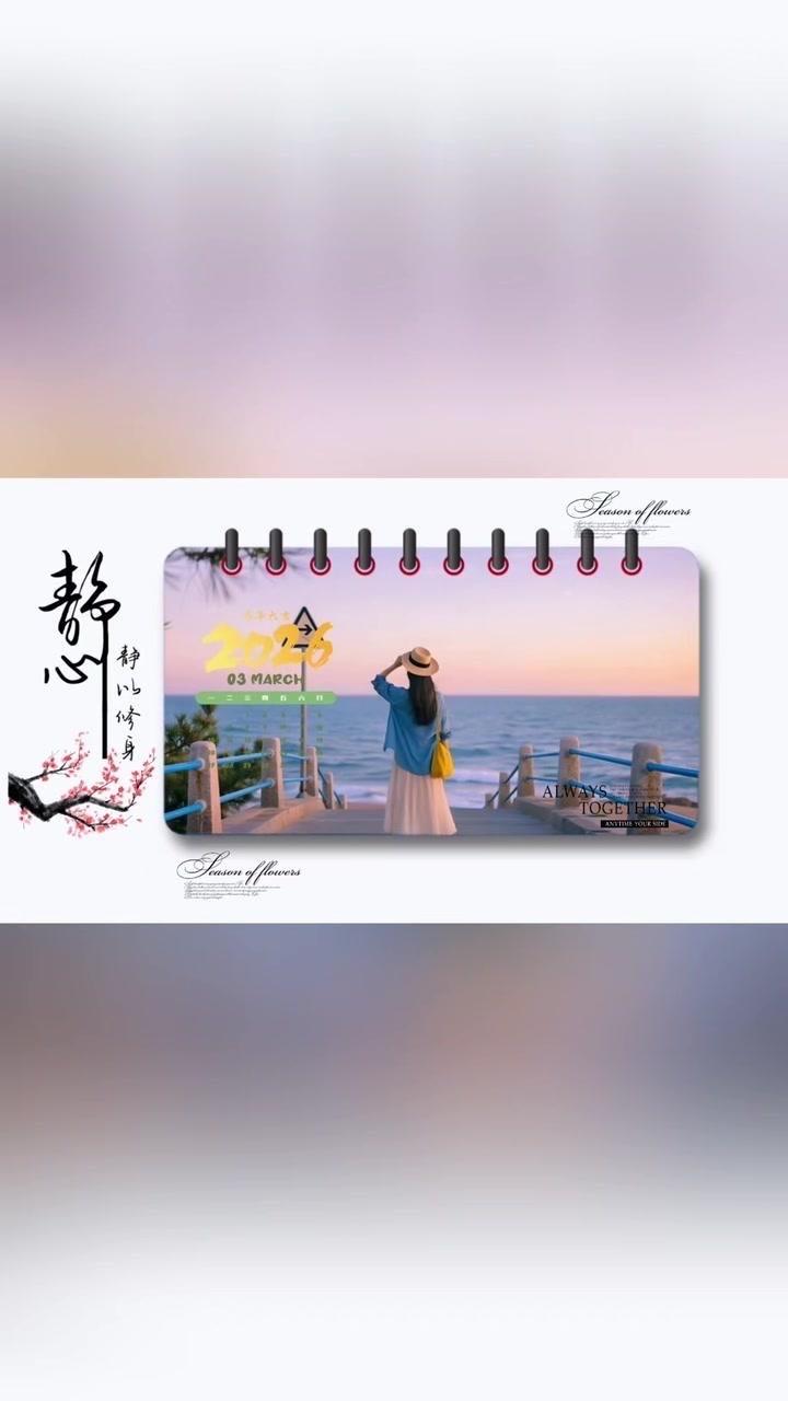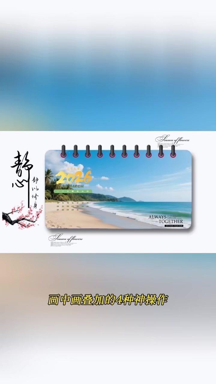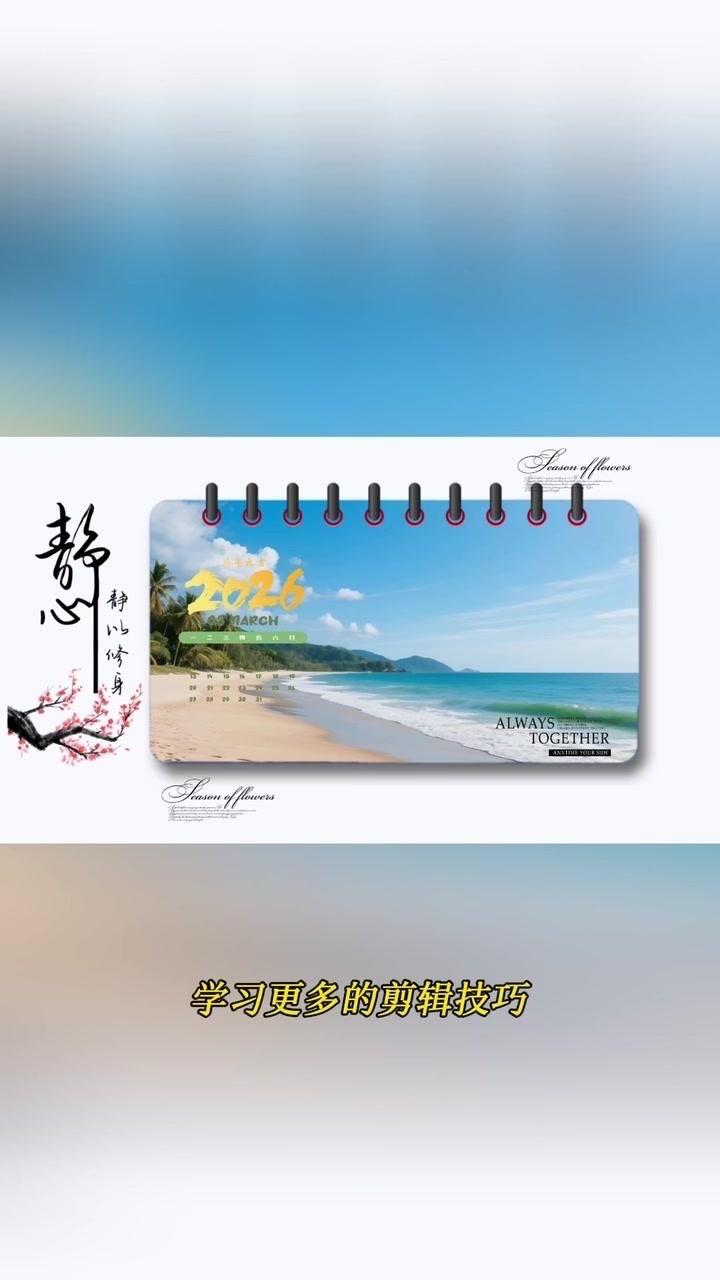 1️⃣准备素材:先导入几段2秒左右的视频,点击中间小白块,添加幻灯片下移时长并拉满应用全局。 2️⃣制作日历:点贴纸搜索2026日历摆好位置,音效添加撕纸声放在转场小方块下,导出备用。 3️⃣立体效果:重新导入素材,添加立体边框并移至右侧,主视频缩小放边框内,用吸色取画布颜色,最后添日历环和其他贴纸。