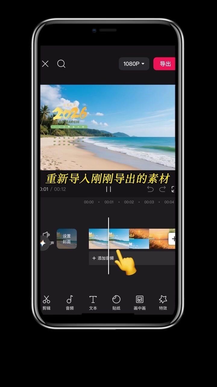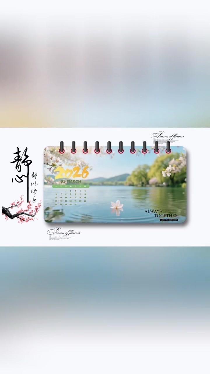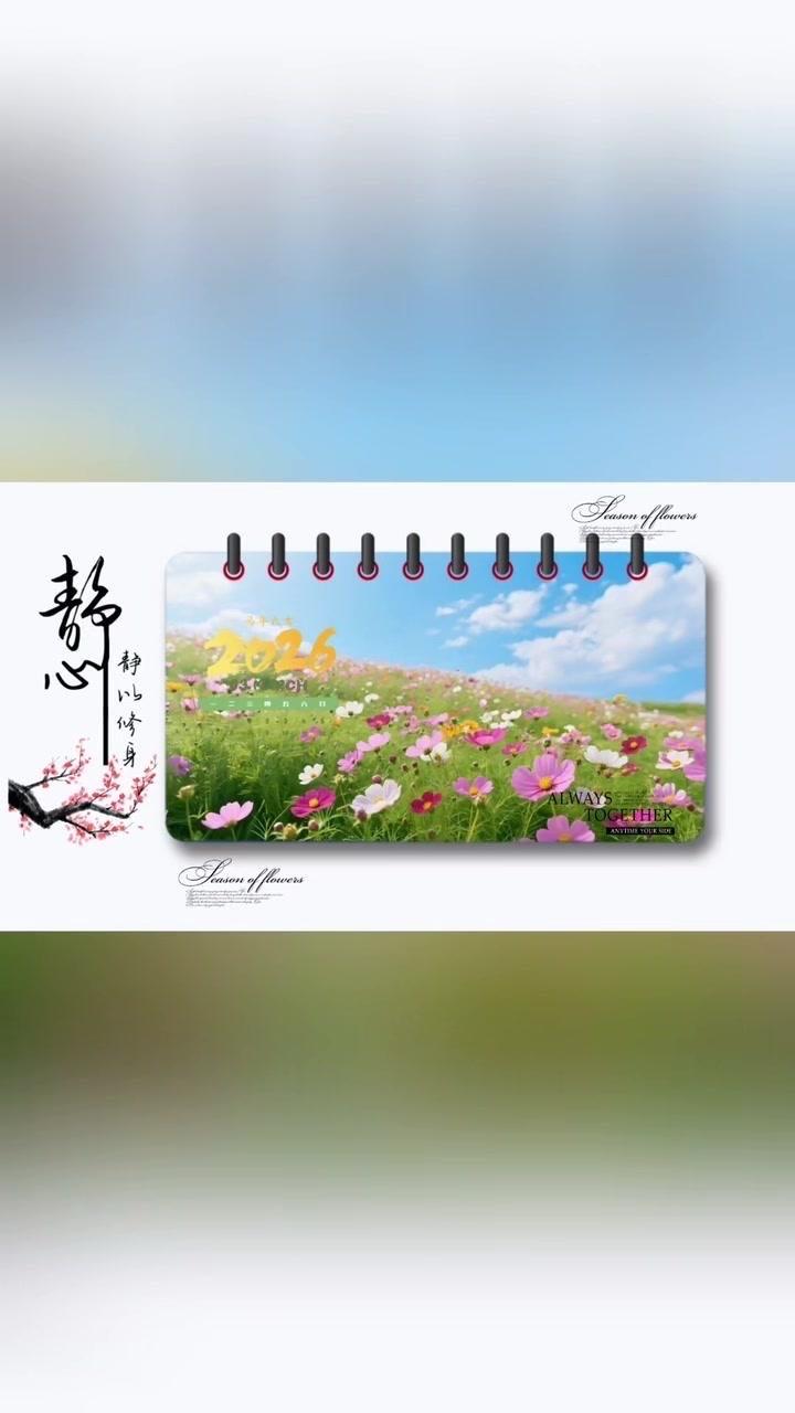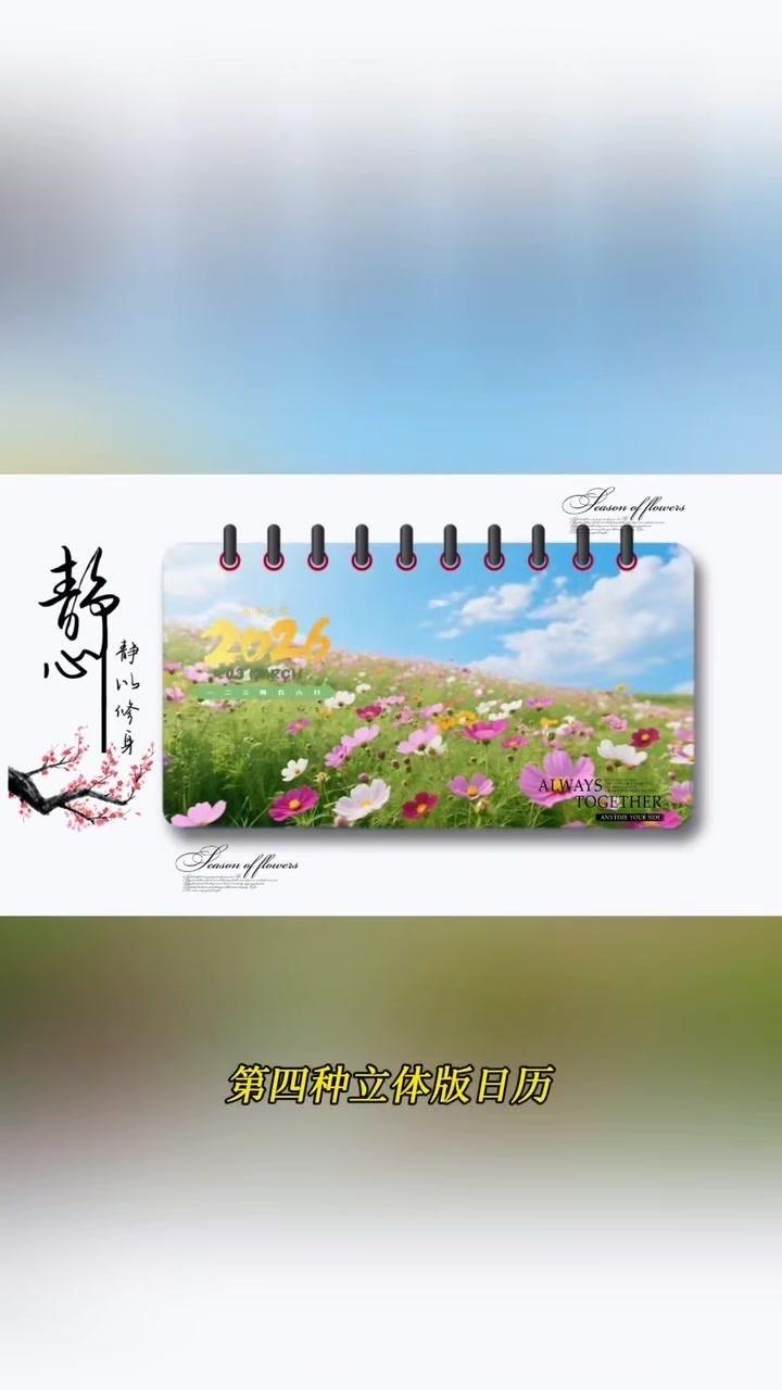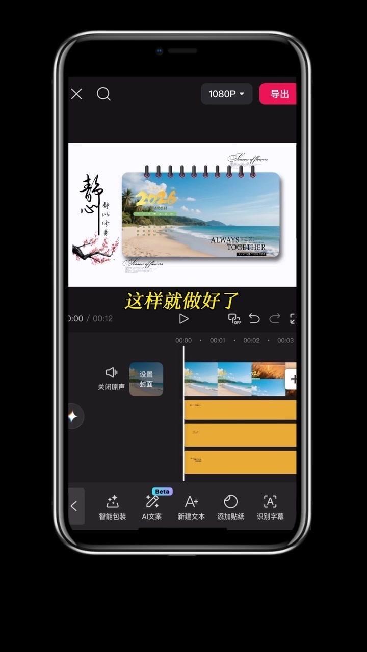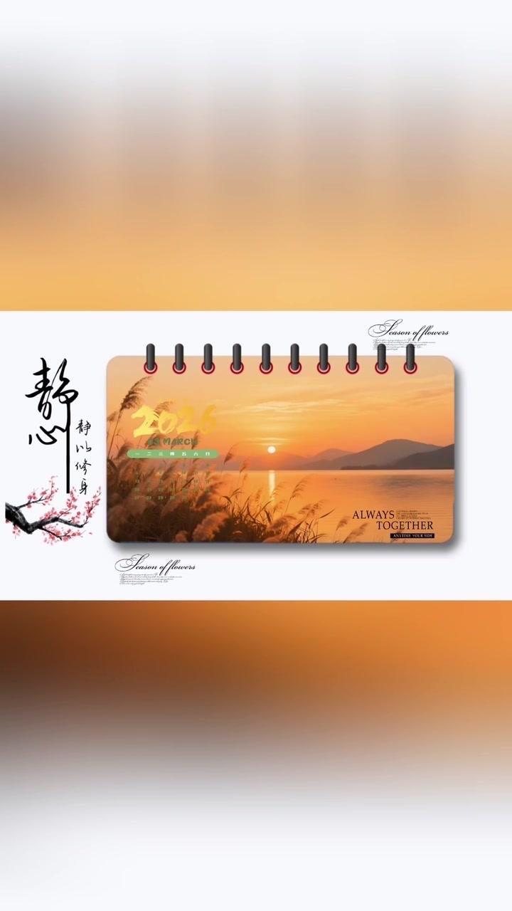 1️⃣准备素材:先导入几段2秒左右的视频,点击中间小白块,添加幻灯片下移时长并拉满应用全局。 2️⃣制作日历:点贴纸搜索2026日历摆好位置,音效添加撕纸声放在转场小方块下,导出备用。 3️⃣立体效果:重新导入素材,添加立体边框并移至右侧,主视频缩小放边框内,用吸色取画布颜色,最后添日历环和其他贴纸。