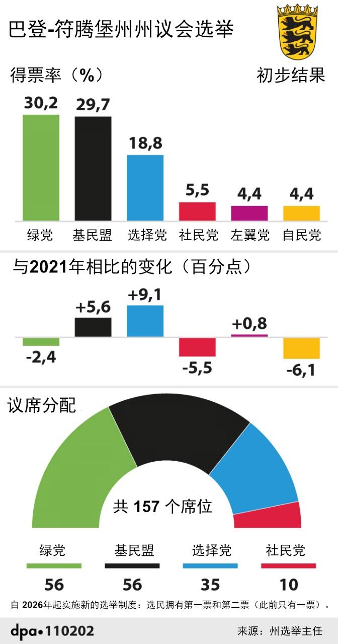 巴登-符腾堡州州议会选举 2026年对德国来说是一个“超级选举年”,因为今年将举行五场州议会选举:分别在巴登-符腾堡州、莱茵兰-普法尔茨州、萨克森-安哈尔特州、柏林以及梅克伦堡-前波莫瑞州。 德国是一个联邦制国家。除了代表整个国家、决定联邦层面政策的德国联邦议院之外,德国16个联邦州中的每一个州也都有自己的地方议会,即州议会。 每五年,各联邦州的居民都会重新选举州议会,从而决定哪些政党能够进入州议会。州议会选举是德国民主的重要基石,因为通过投票,公民可以直接参与决定影响自己家园的政策。选举使公民能够在教育、地方基础设施等重要生活领域参与家乡的政治决策,因为这些事务的管辖权主要属于各联邦州的地方政府。 上周末,今年的第一场州议会选举已经举行。根据巴登-符腾堡州统计局公布的初步官方结果,绿党在其首席候选人杰姆·厄兹德米尔的带领下以 30.2% 的得票率位居第一,略微领先于由首席候选人曼努埃尔·哈格尔率领、获得 29.7% 选票的基民盟。按照这一结果,两党将在州议会中各获得 56个席位,共占州议会三分之二的多数席位。 今年的投票率为69.6%,明显高于2021年的上一次选举。最终的官方选举结果通常在选举结束后几天,当所有邮寄选票都计入后才能确定。 在选举当晚的一档电视节目中,哈格尔向厄兹德米尔祝贺胜选。厄兹德米尔也在当晚表示,希望与基民盟再次“平等”合作。 接下来我们也会继续带大家关注接下来的各场州议会选举,敬请关注!