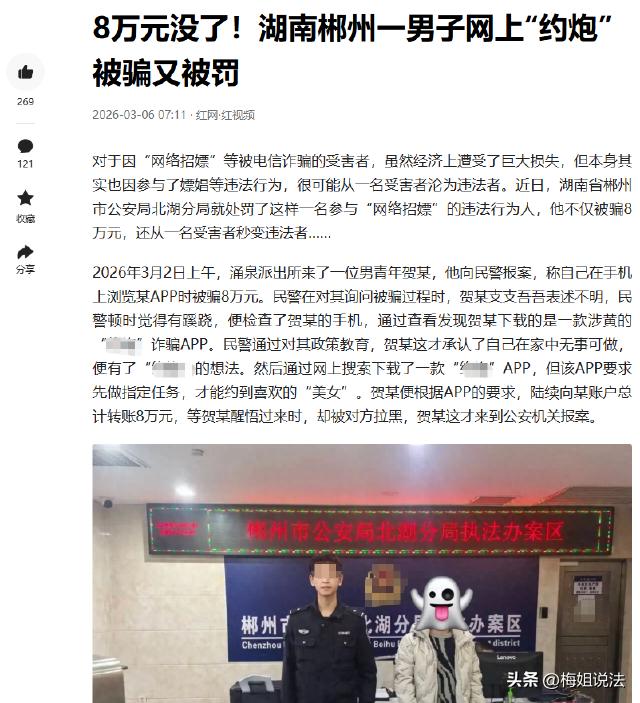 湖南郴州,男子贺某下载了个招嫖软件,想进行钱色交易,结果充了8万多元也没见到人,