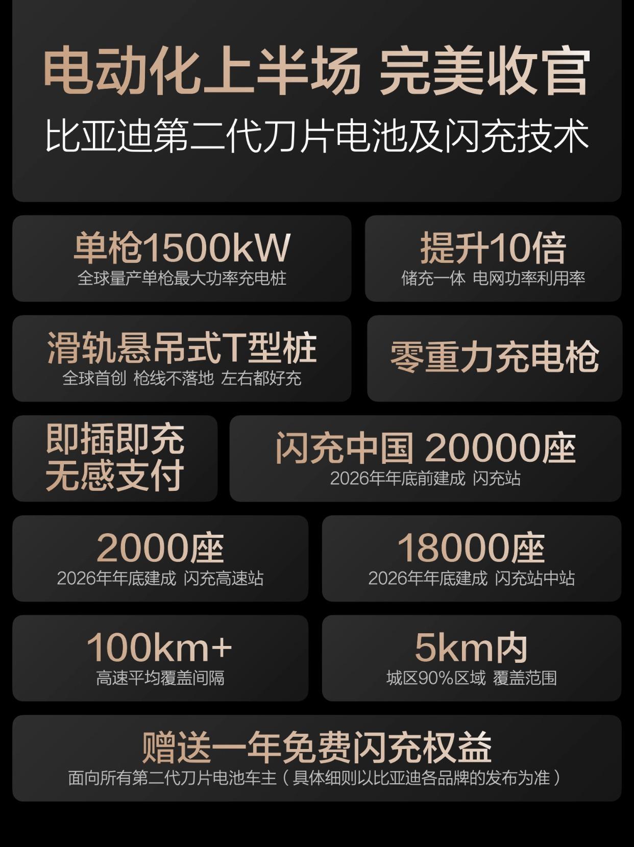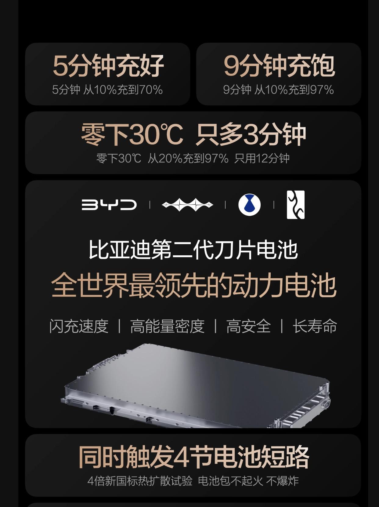 比亚迪最有底气说“闪充不影响电池寿命”! 2026年3月5日,比亚迪发布第二代刀片电池,实现"常温5分钟充好、9分钟充饱。零下30度低温仅多3分钟"的全球量产最快充电速度。”。充电速度这么快,有些朋友会有疑问,闪充会不会影响电池寿命? 一、技术突破:闪充与长寿命兼得 比亚迪发布第二代刀片电池,通过"锂离子高速通道"和"全温域智能热管理系统",成功解决闪充产热难题,让大功率充电对电池寿命几乎无影响,真正做到充得快、更耐用。 二、安全性能:远超新国标的严苛验证 第二代刀片电池通过三项极限安全测试:500次闪充循环后边闪充边针刺无热失控;同时触发4节电池短路无热扩散;承受10倍新国标能量的底部撞击仍不起火爆炸。全生命周期安全稳定,彻底打消用户安全顾虑。 三、质保加码:容量保持率提升至77.5% 基于对产品的充分自信,比亚迪将电池质保"容量保持率"整体提升2.5%,低于77.5%即免费包换,电芯终身保修,给用户最强定心丸。 四、行业地位:电池大王再定义标准 从第一代针刺测试重新定义安全,到第二代解决闪充与寿命矛盾,比亚迪凭借30年电池技术积淀和全产业链优势,持续掌握动力电池核心技术定义权,以硬核实力巩固"电池大王"领先地位。 总之,比亚迪发布第二代刀片电池,是硬核闪充技术树立行业新标杆!可以超有底气说“闪充不影响电池寿命”!