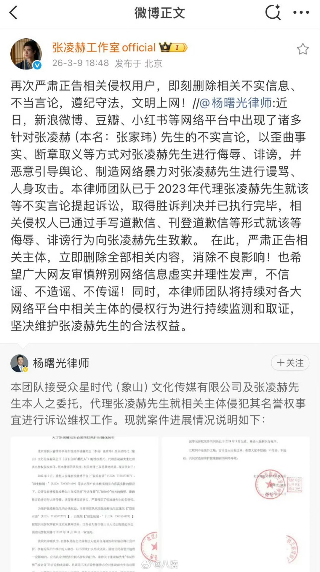 张凌赫工作室再次严肃正告看了下张凌赫工作室的声明,其实逻辑很清楚:“考试作弊”是法院已经认定的诽谤言论,现在又有人在微博、豆瓣、小红书上传播,所以才再次发正告。维权从2023年打到现在,连强制执行都走完了,不是临时起意。吃瓜归吃瓜,别把人身攻击和正常剧评混为一谈。