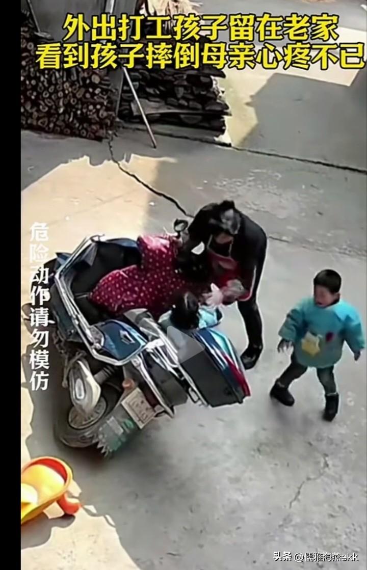 心疼!她有什么错?同样是孙子,孙女还小些,并且被摩托车砸得更重,奶奶却对孙女打骂,在外务工的母亲看到监控,无奈又心疼。 门口停放的摩托车上,三四岁的哥哥趁大人不注意爬了上去,鼓捣着摩托车手柄正玩得嗨。 一两岁的妹妹也跑了过来,扒着哥哥想上去,摩托车一下子失去平衡倒了下来,妹妹完全压在车下,哇哇大哭。 孩子的哭声惊动了奶奶,奶奶赶紧跑了过来,用力将摩托车托离地面,哥哥一溜烟地爬起来跑开了,奶奶一把从车底将孙女拽了出来,顺手就是一巴掌打在她的胳膊上,孙女又惊又吓哭得更厉害了。 奶奶正在气头上,将孙女拽出来后,就朝着孙儿骂骂咧咧地转身走开,完全不顾还在哭的孙女。 刚被拽起的妹妹,估计左脚被砸痛了,一个踉跄差点摔饺,哭着一瘸一拐的跟在奶奶后面。 奶奶又骂骂咧咧地回头抱起妹妹,一只手将妹妹的脚晃了几下,觉得没问题,继续骂着朝孙女嘴上打了几巴掌。 不怪妈妈看见监控心疼死了,这么小的孩子知道啥?摩托车砸下来就很疼的,奶奶不是先验伤安抚孩子,而是上前就是又打又骂,可见已成习惯了。 没有耐心的人真不适合带孩子,这种情况下,打骂一点不起作用,只会给孩子造成性格上的缺陷,给孩子讲道理更有效。 也可能奶奶重男轻女,看她拉孙女的动作,不仅粗鲁,还很不耐烦,看不出疼爱。 这种环境下的孩子从小就会看人脸色过日子,自卑胆怯,会影响她的人生。 所以,很多人在走入社会后,因性格的缺陷影响人生时,总是痛恨原生家庭,没有情感交流,更不知道该怎么去爱。 她那么小,正是认识世界,容易犯错的年纪,她有什么错?作为家长,应该允许孩子犯错,用爱用耐心去帮助孩子认识错误,改正错误,而不是使用暴力,让孩子对亲人望而生畏,不敢释放快乐,畏手畏脚。 美好的童年治愈一生,不幸的童年需要一生治愈。