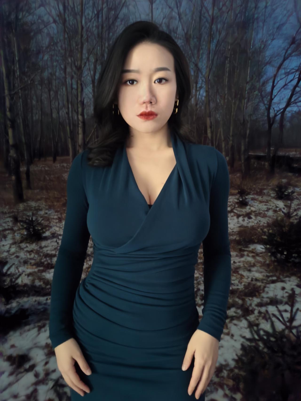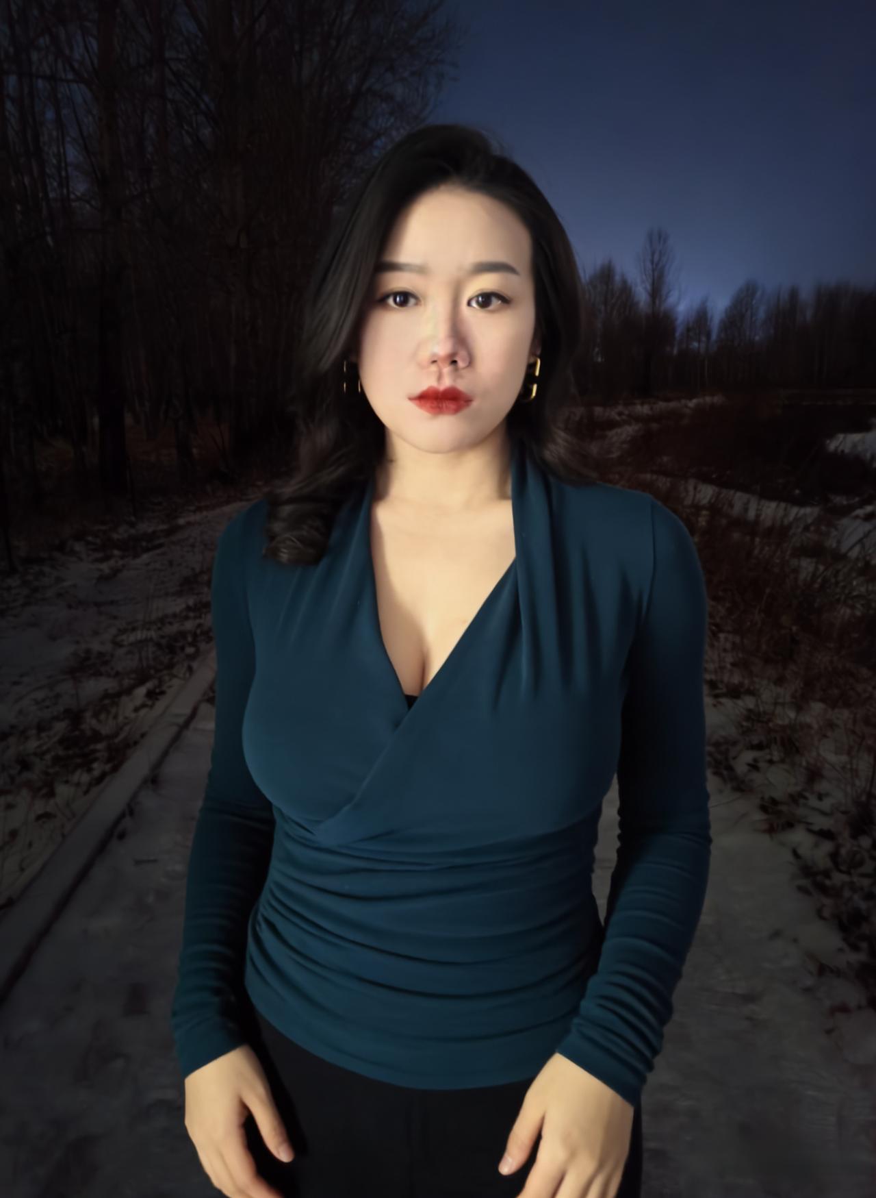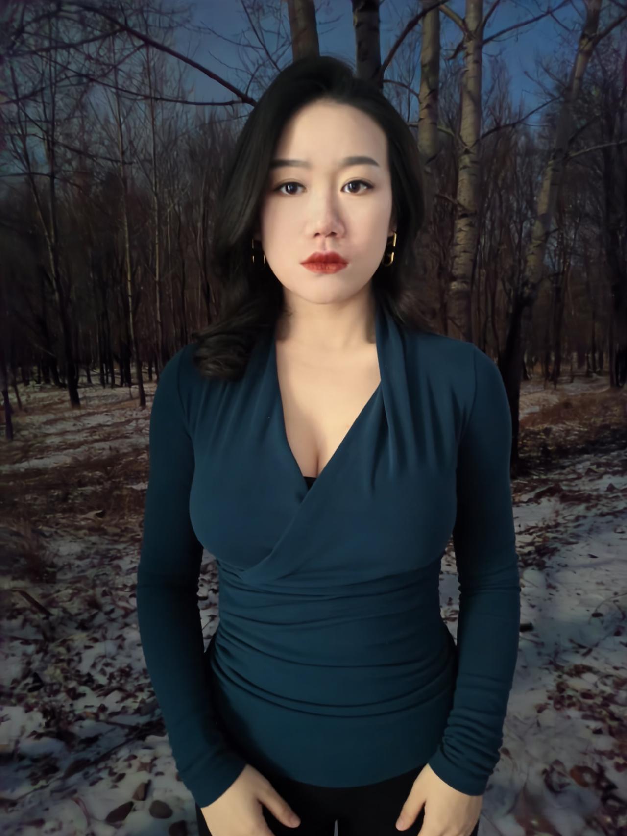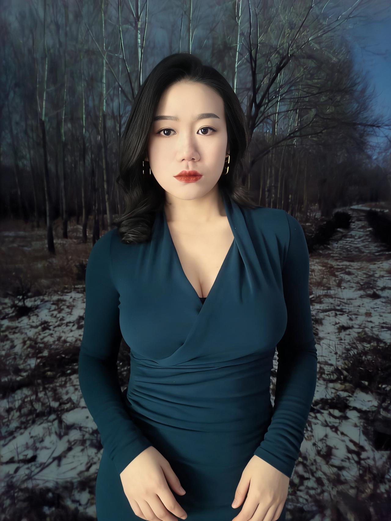 冬夜的路,铺着雪与枯叶的缠绵, 风穿过疏林,带着凉意,却吹不散你周身的淡。 孔雀蓝的针织裹着身姿,褶皱顺着曲线蜿蜒, 像夜的绸带,轻轻缠绕,勾勒出从容的弧线。 ~ 耳间的金环,是暗夜里的星环,轻晃着,不耀眼, 却在眉眼间,添了几分精致,几分安然。 雪落在发梢,凝成细碎的霜,与黑发相映, 像冬夜写给你的诗,每一笔,都温柔且缱绻。 ~ 你站在那里,不是过客,是这夜的主角, 林莽为幕,寒夜为底,你是最动人的那抹蓝。 不必刻意,不必张扬,静立便是万语千言。 ~ 夜色漫过你的肩,将轮廓晕成柔和的边, 雪在脚边轻眠,风在耳畔轻吟, 而你,是冬夜林径上,最惊艳的落款。