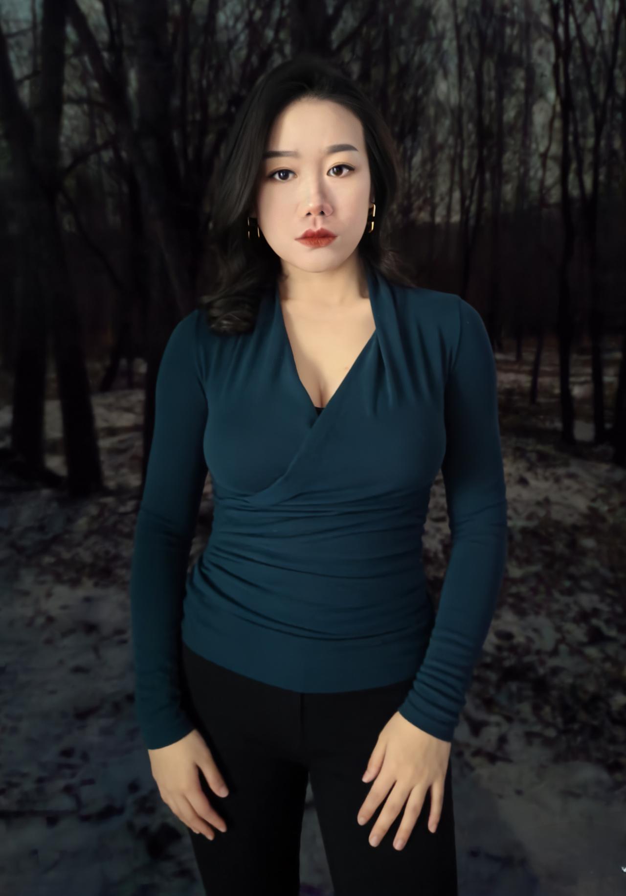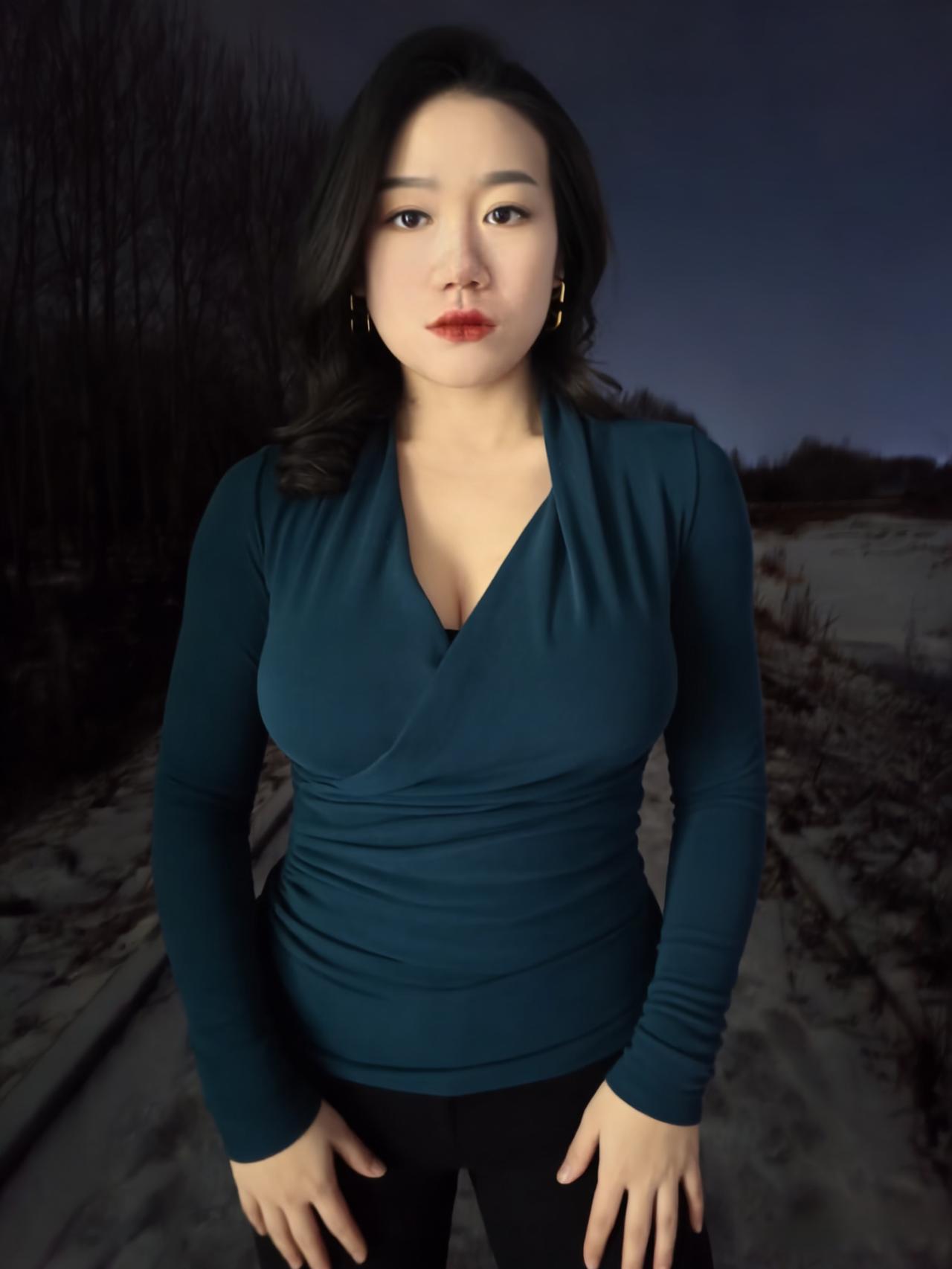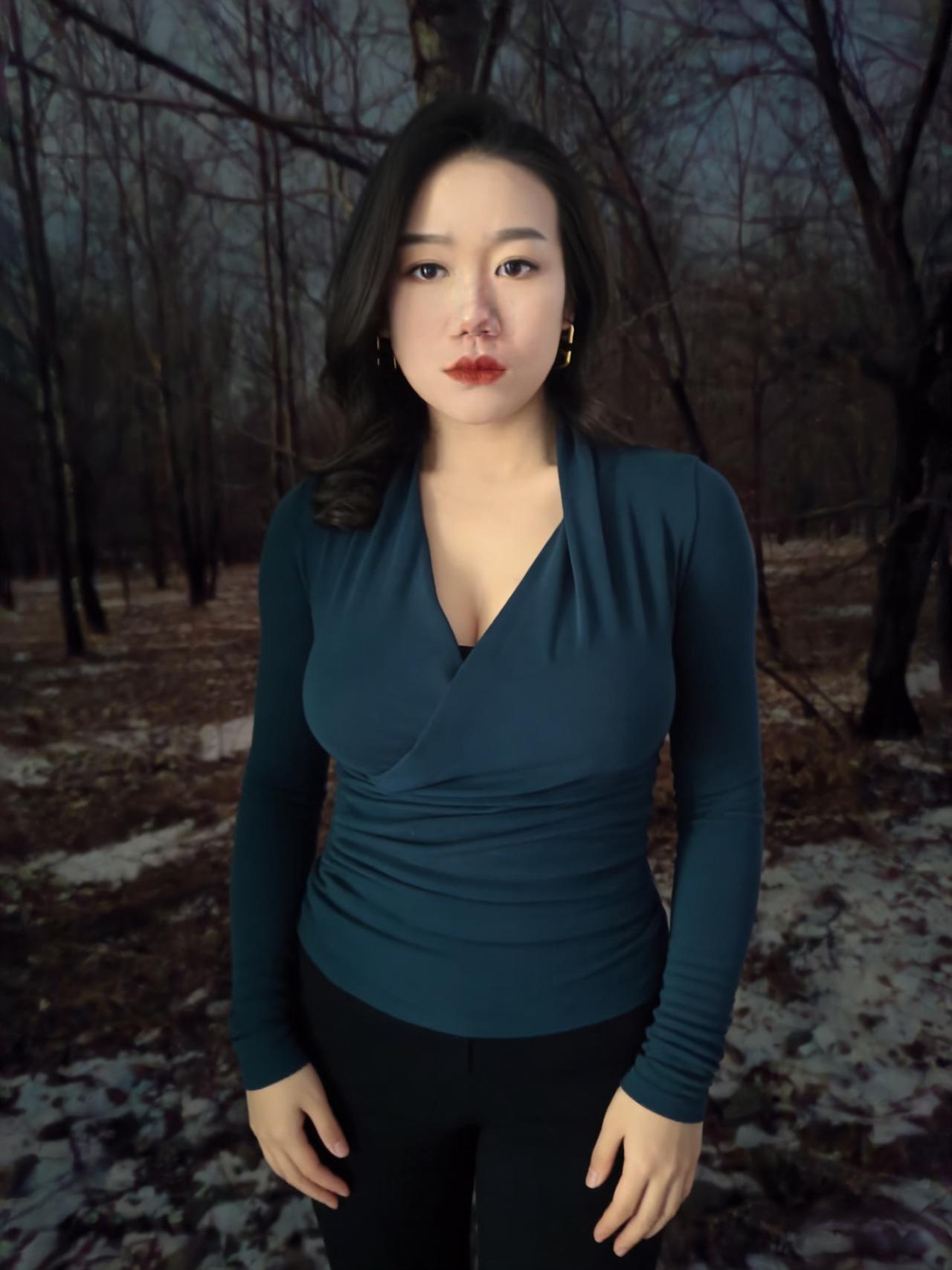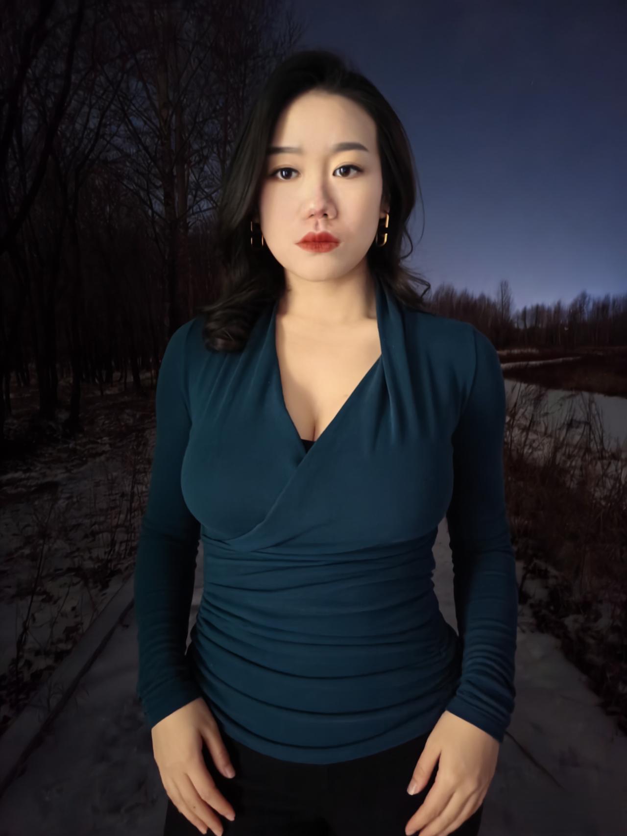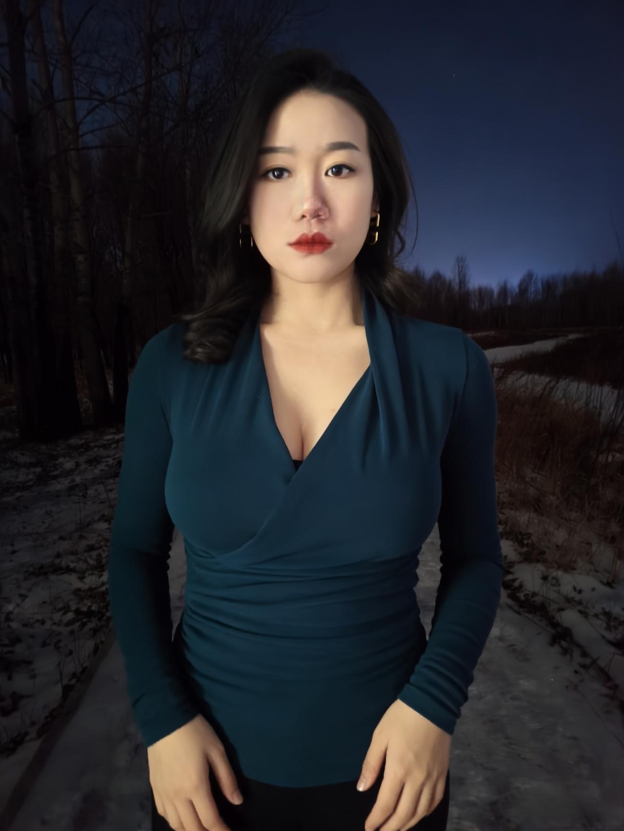 冬夜的路,铺着雪与枯叶的缠绵, 风穿过疏林,带着凉意,却吹不散你周身的淡。 孔雀蓝的针织裹着身姿,褶皱顺着曲线蜿蜒, 像夜的绸带,轻轻缠绕,勾勒出从容的弧线。 ~ 耳间的金环,是暗夜里的星环,轻晃着,不耀眼, 却在眉眼间,添了几分精致,几分安然。 雪落在发梢,凝成细碎的霜,与黑发相映, 像冬夜写给你的诗,每一笔,都温柔且缱绻。 ~ 你站在那里,不是过客,是这夜的主角, 林莽为幕,寒夜为底,你是最动人的那抹蓝。 不必刻意,不必张扬,静立便是万语千言。 ~ 夜色漫过你的肩,将轮廓晕成柔和的边, 雪在脚边轻眠,风在耳畔轻吟, 而你,是冬夜林径上,最惊艳的落款。