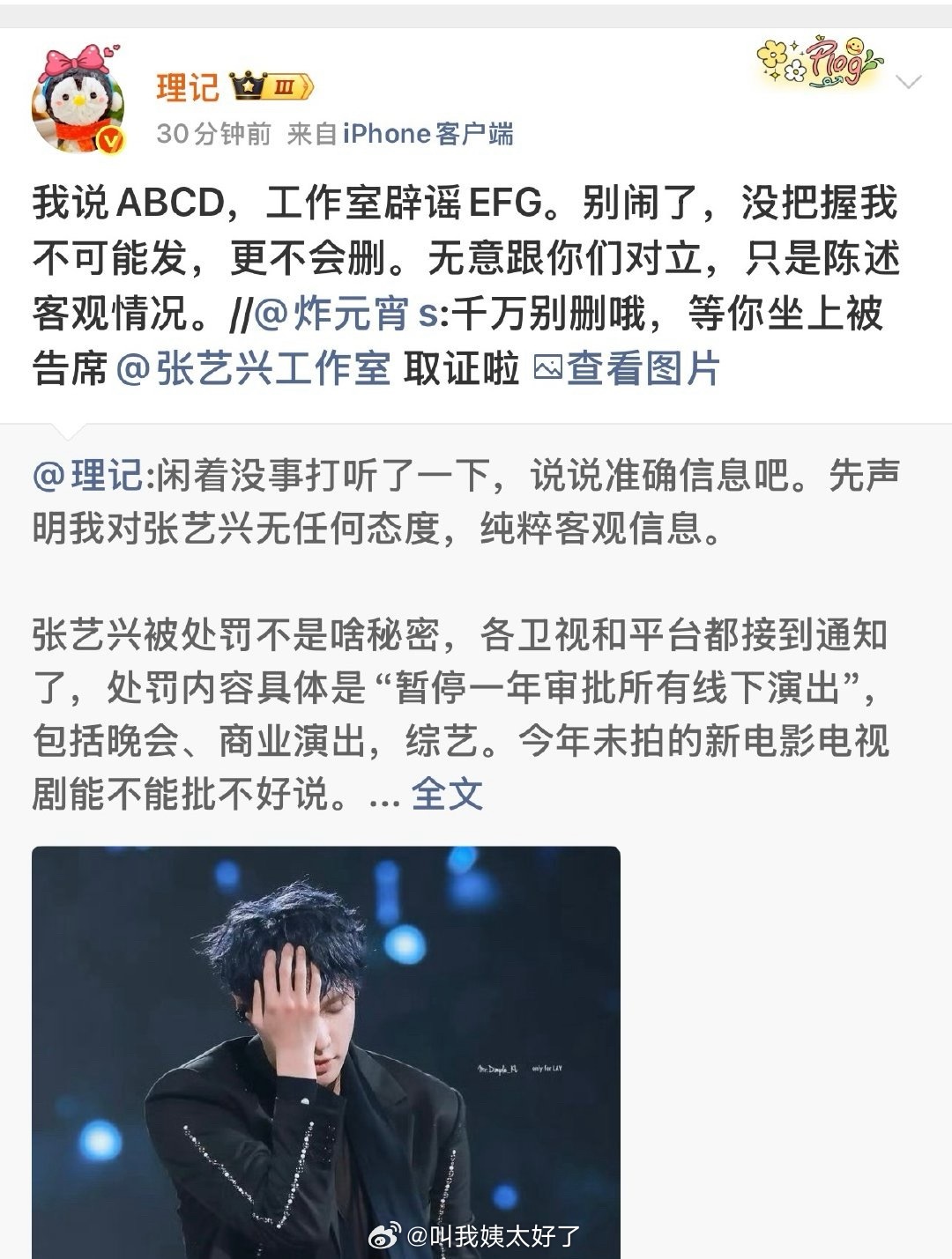 理记对张艺兴这件事情的观点:张艺兴被处罚不是啥秘密。他发完这段话以后张艺兴工作室