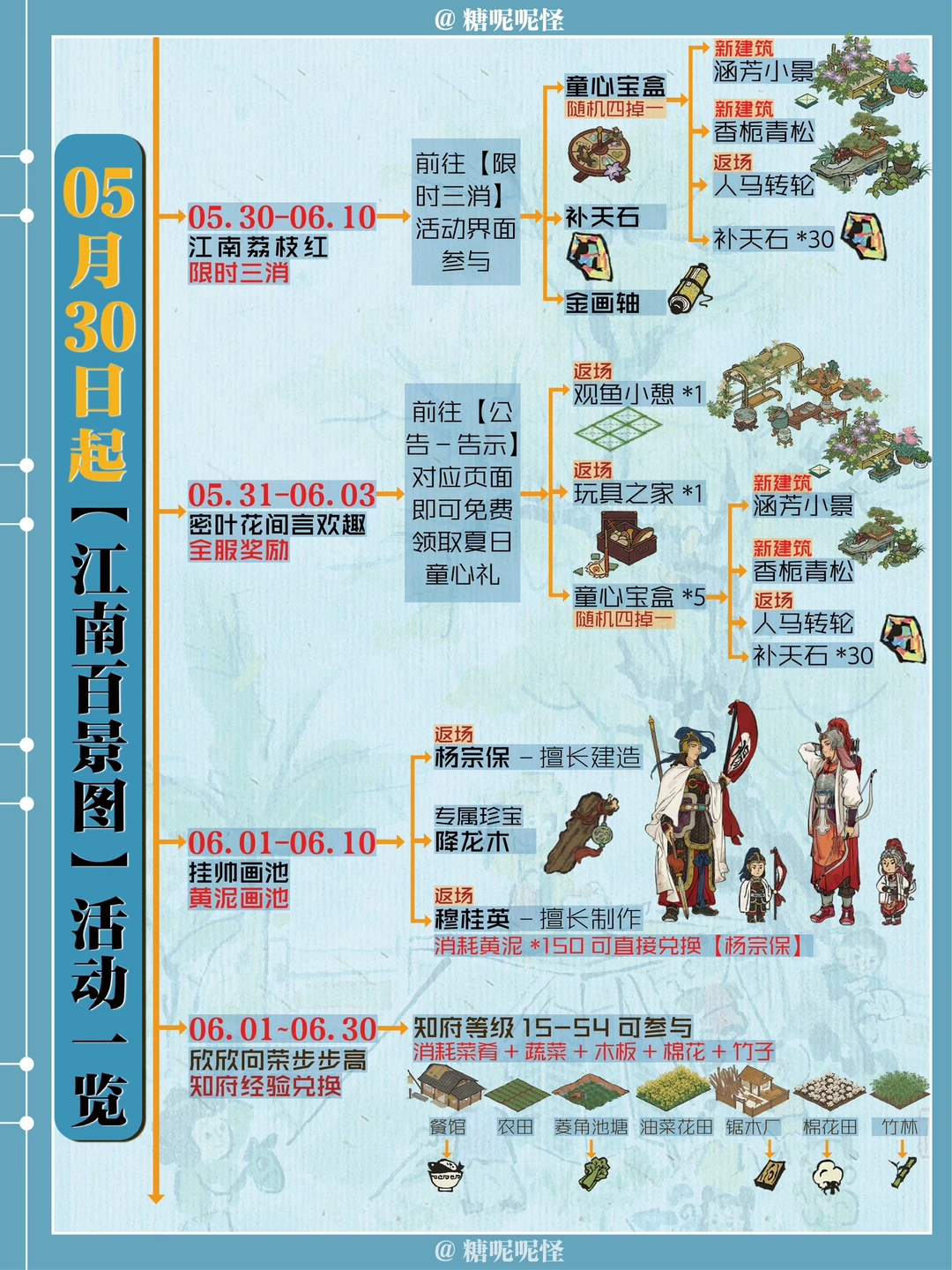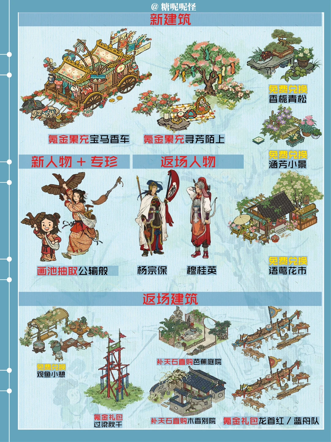 🩵新建筑:宝马香车|寻芳陌上|香栀青松|涵芳小景|莺语花市 🩵新人物:公输般 🩵返场建筑:过梁秋千|观鱼小憩|龙首红/蓝舟队