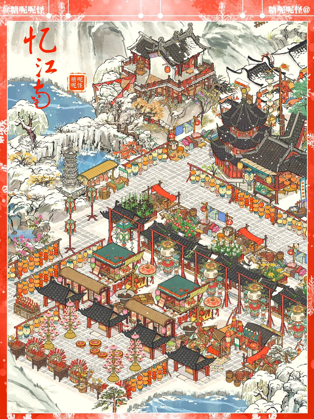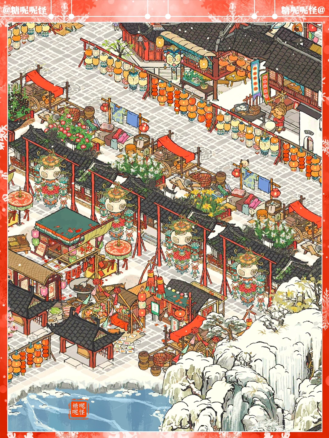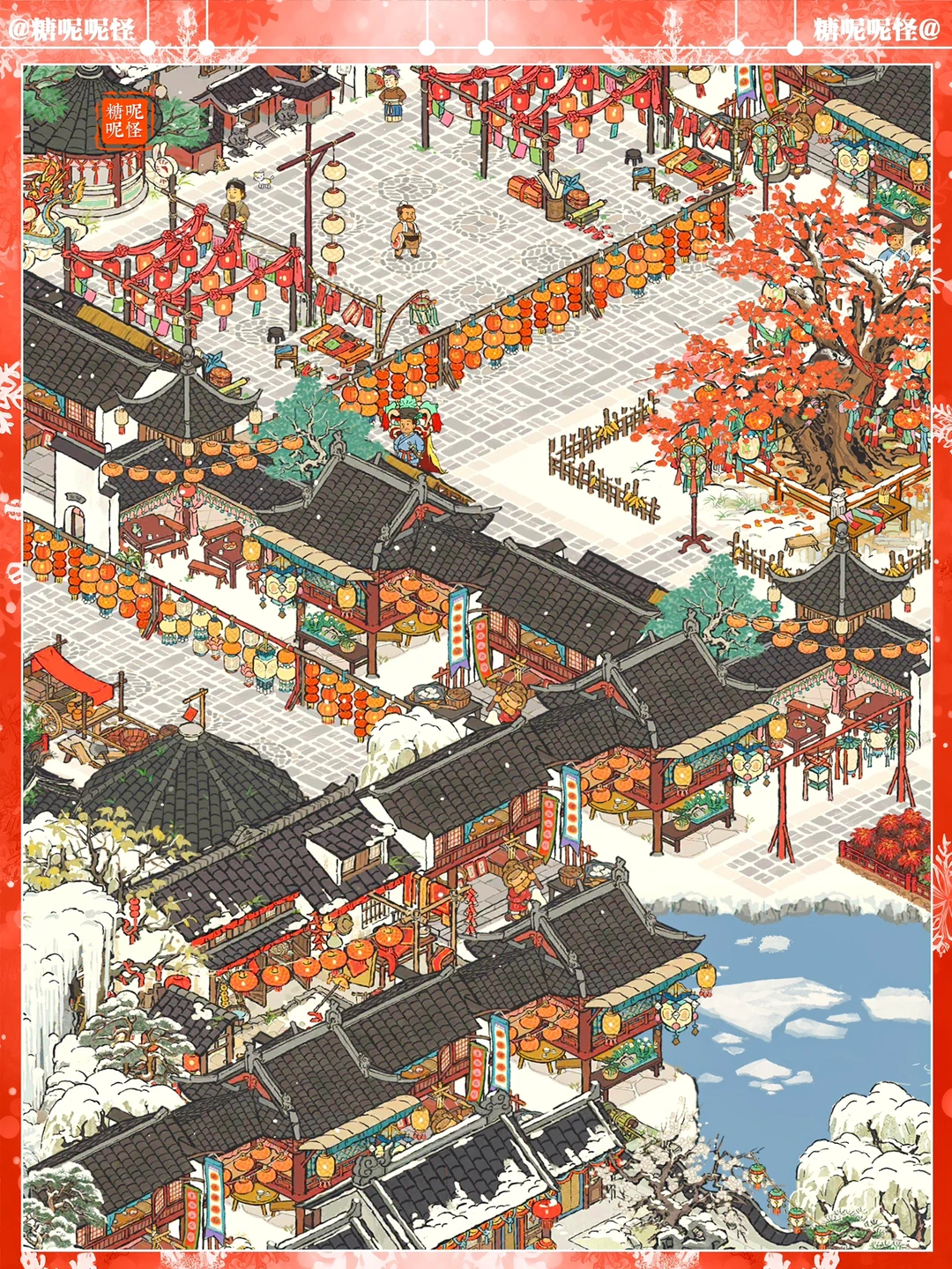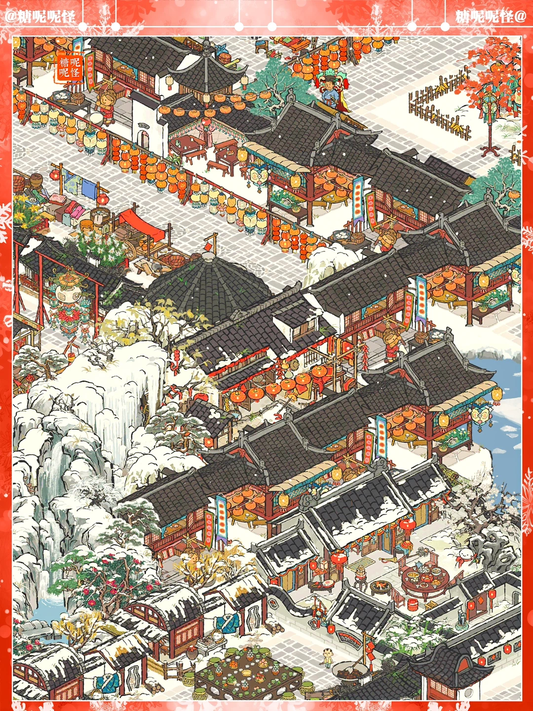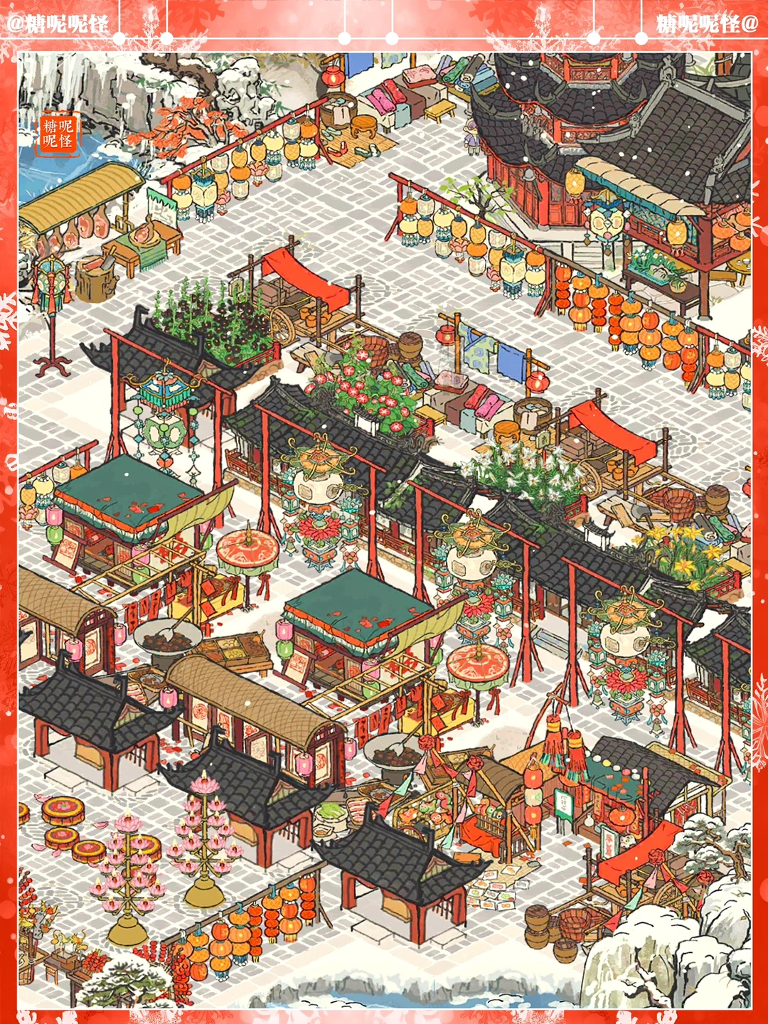❄️白雪镇凌寒塘+雅居塘雪景布局 ❄️灯会画池上大分了 ❄️建筑:魁星楼|糯米铺子|花灯回廊|杂货小摊|日用小摊|美食小摊|别院回廊|年味老家|窗花店|对对玩具店|灯谜架|喜结连理