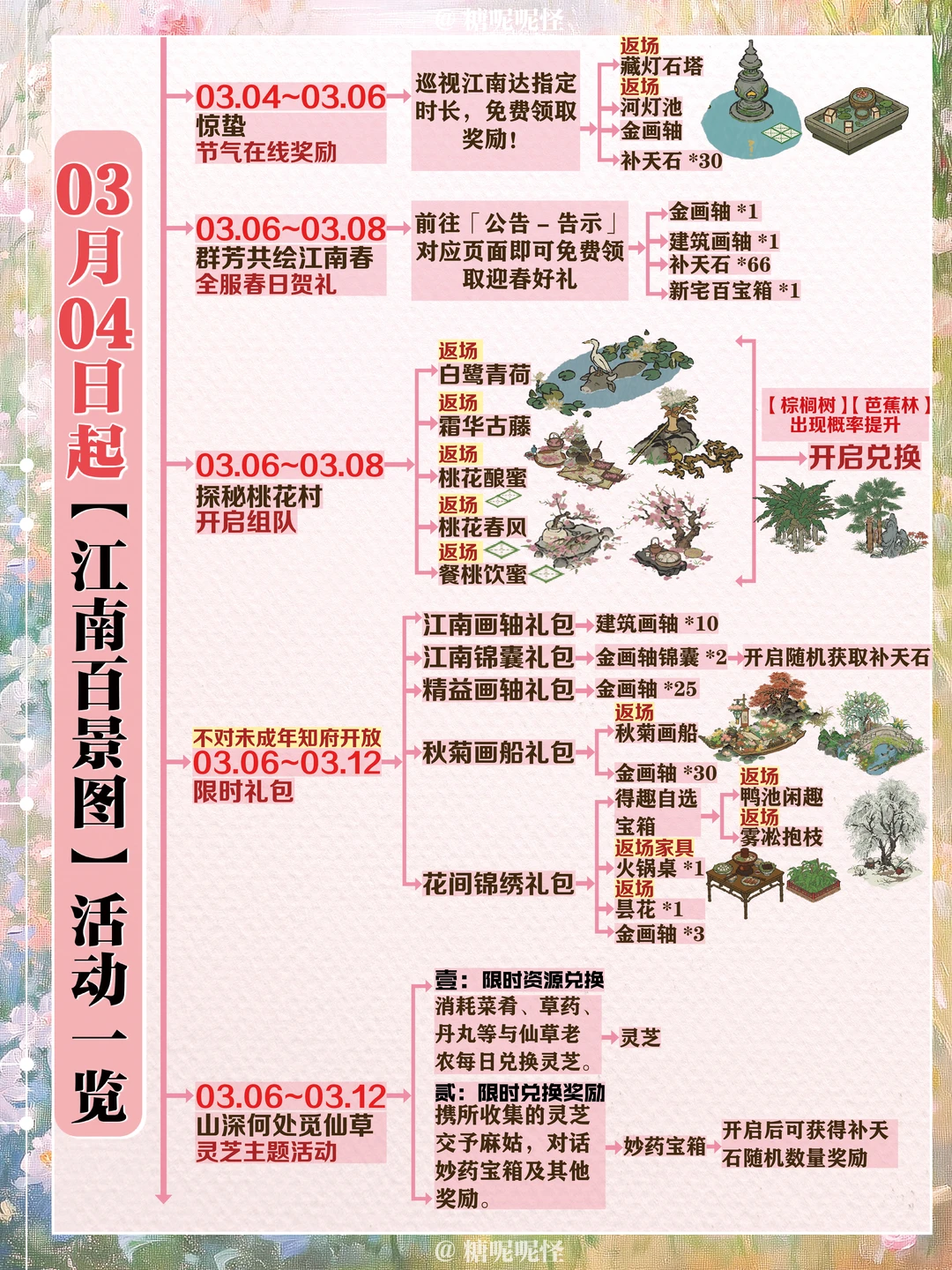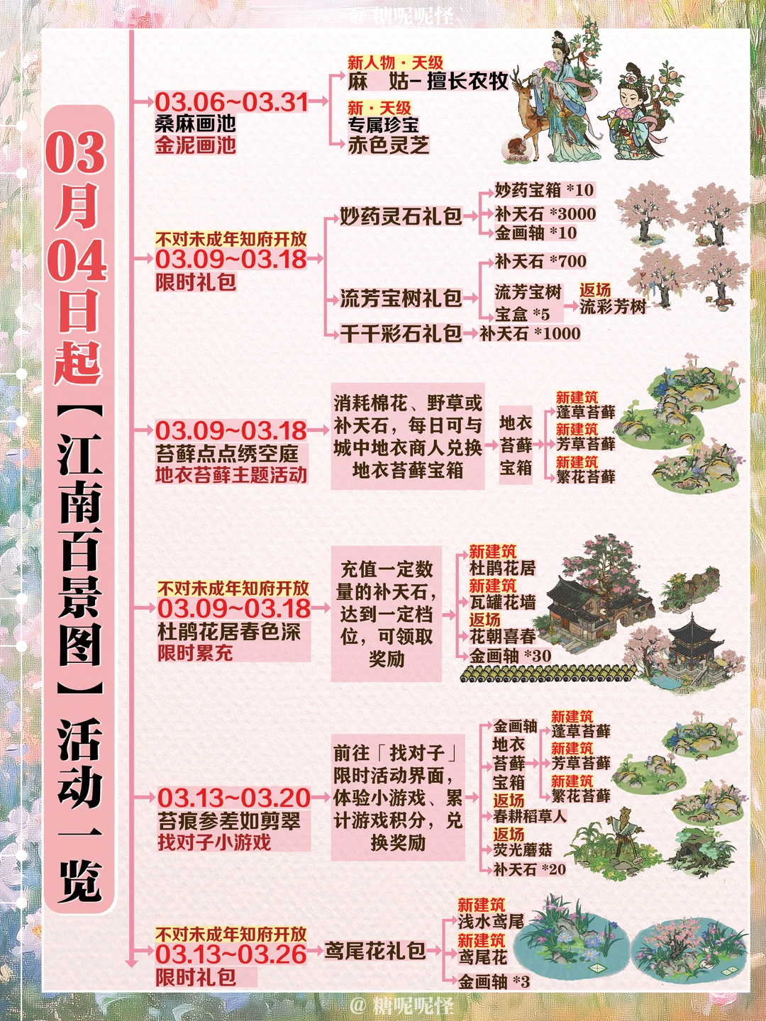 新人物:麻姑 新建筑:杜鹃花居|瓦罐花墙|繁花苔藓|芳草苔藓|蓬草苔藓|浅水鸢尾|鸢尾花