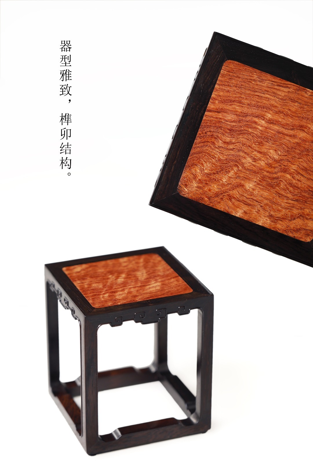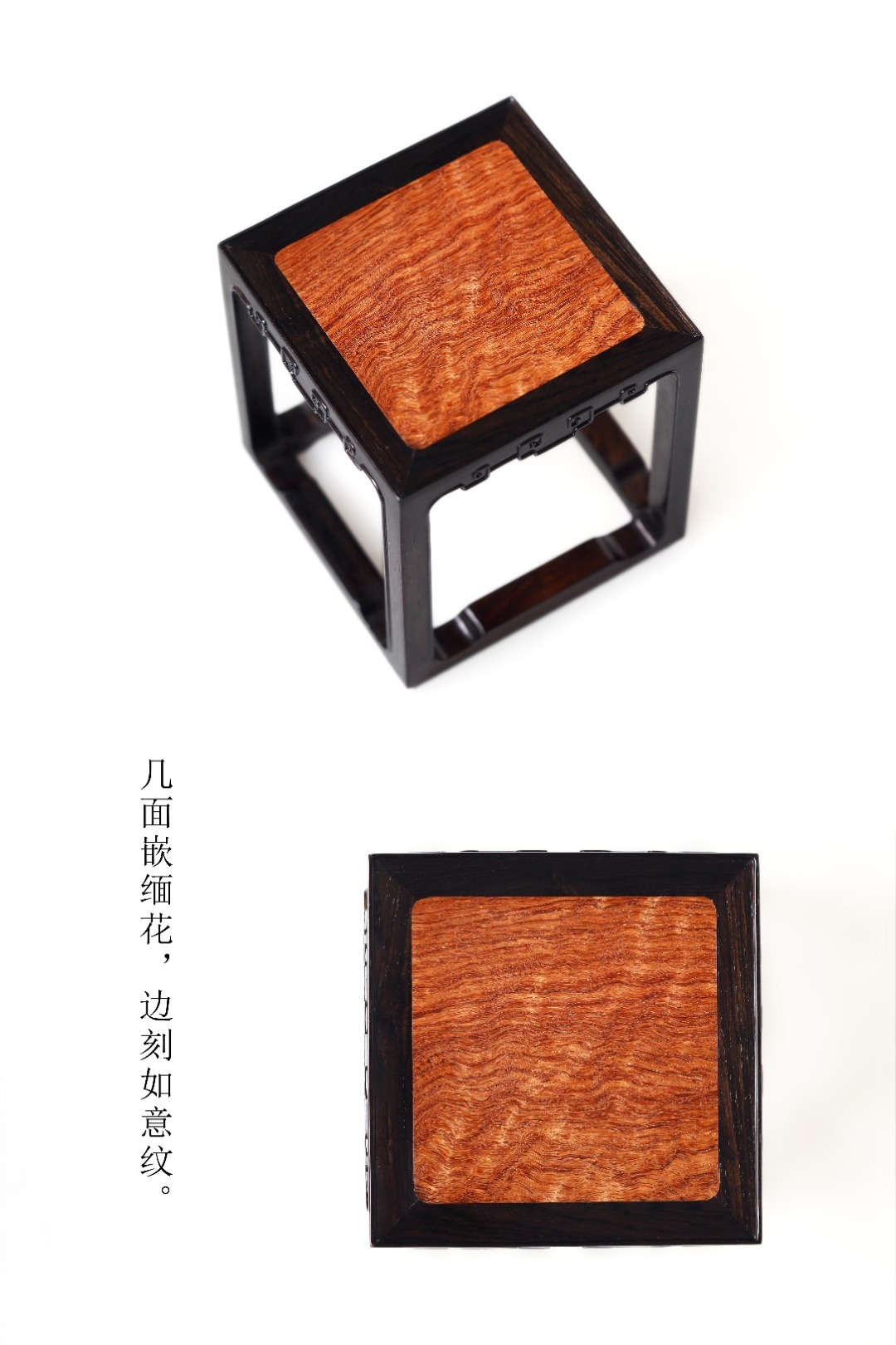 器型雅致,榫卯结构,几面嵌缅花,边刻如意纹;承置清玩珍卉、香器,文雅有韵。