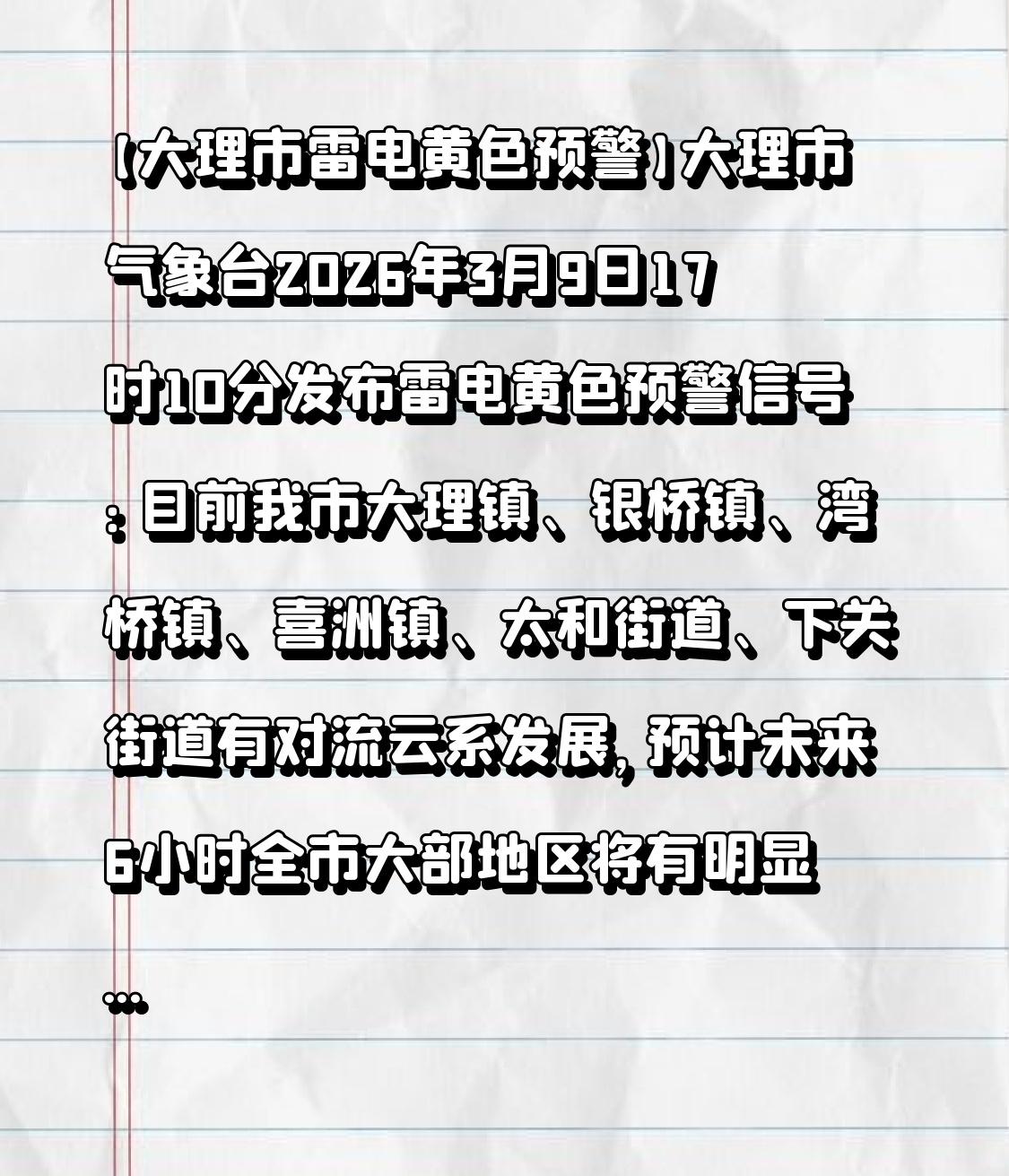 【大理市雷电黄色预警】大理市气象台于2026年3月9日17时10分发布雷电黄色预警信号:当前,我市大理镇、银桥镇、湾桥镇、喜洲镇、太和街道、下关街道有对流云系发展。预计未来6小时内,全市大部分地区将出现明显雷电活动,还会伴有短时强降水、瞬时大风和冰雹等强对流天气,请大家注意防范。 注意防范!大理州发布雷电Ⅳ级预警!
