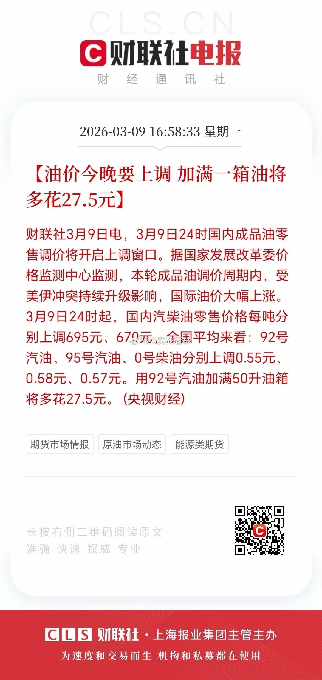 很多人觉得中东冲突和自己没关系,可首批影响这不就来了!而且直接关乎咱们的钱袋子!💰今晚成品油零售价提价,每升涨五毛五到五毛七。就说咱普通人,要是今晚下班不赶紧去加油,明天92号加满一箱油得多掏27.5元。中东是世界油库,冲突一升级,国际油价大涨,国内油价跟着上调。开车通勤的每个月得多花一笔钱。而且油价上涨的影响可不止于此,蔬菜水果运输、种地成本、日用品价格都会受影响。成本如果上升,同样的工资,能买的东西就少了,钱就不经花了。大家还是今晚赶紧去加油吧!