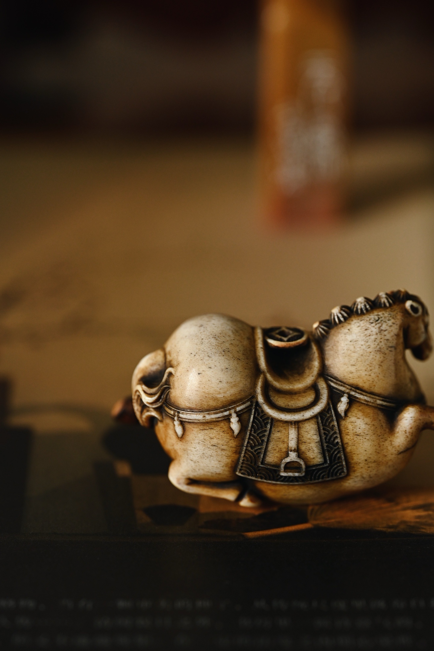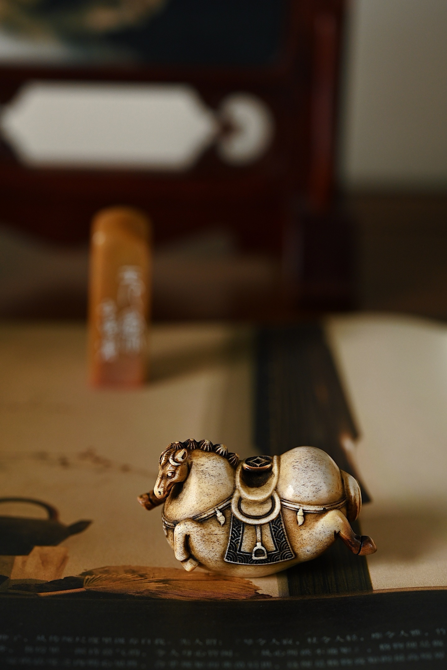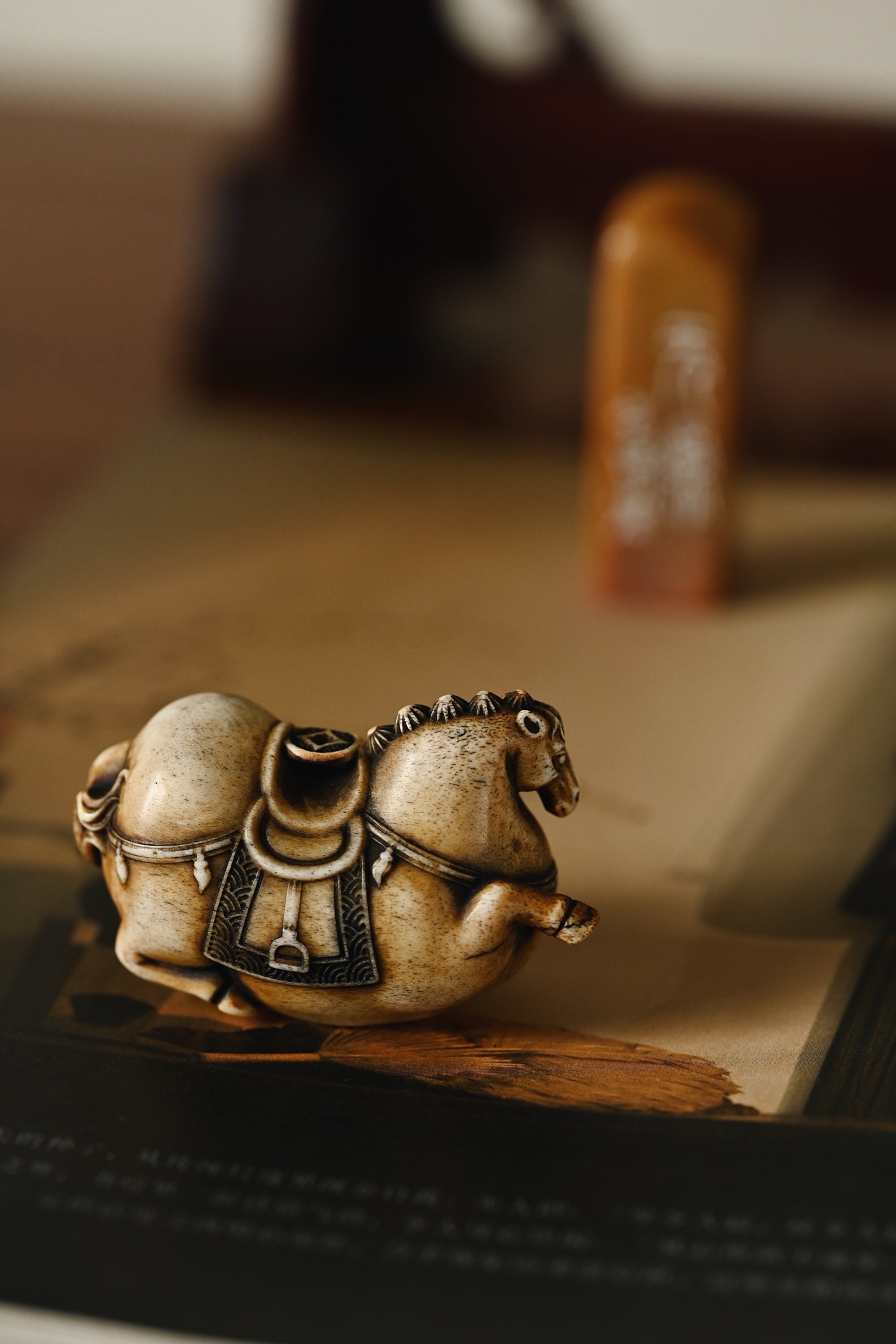 仿古细腻,圆雕饱满结实,塑形写神颇具气势,背驼铜钱,立形达意,祝颂“马上有钱”。