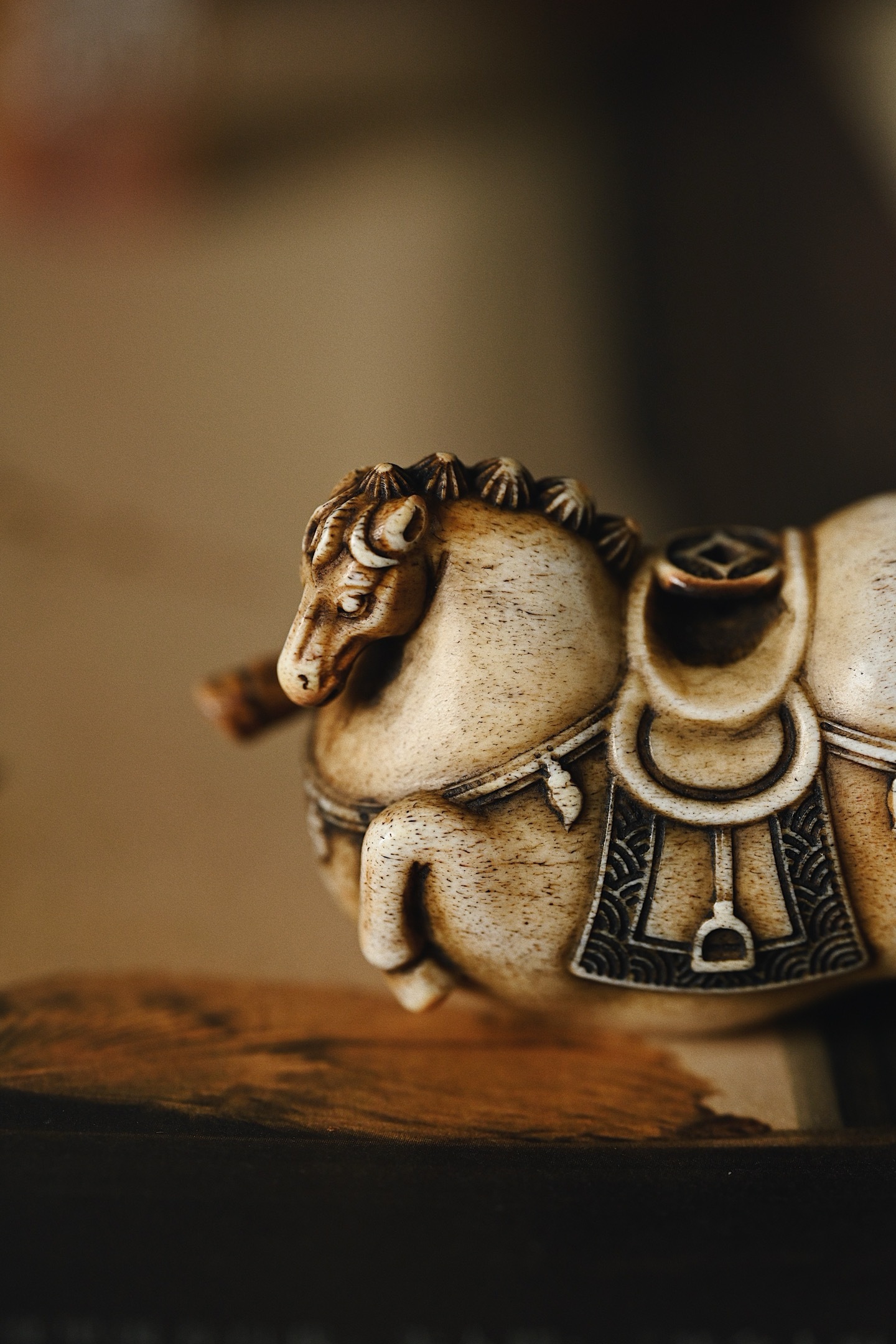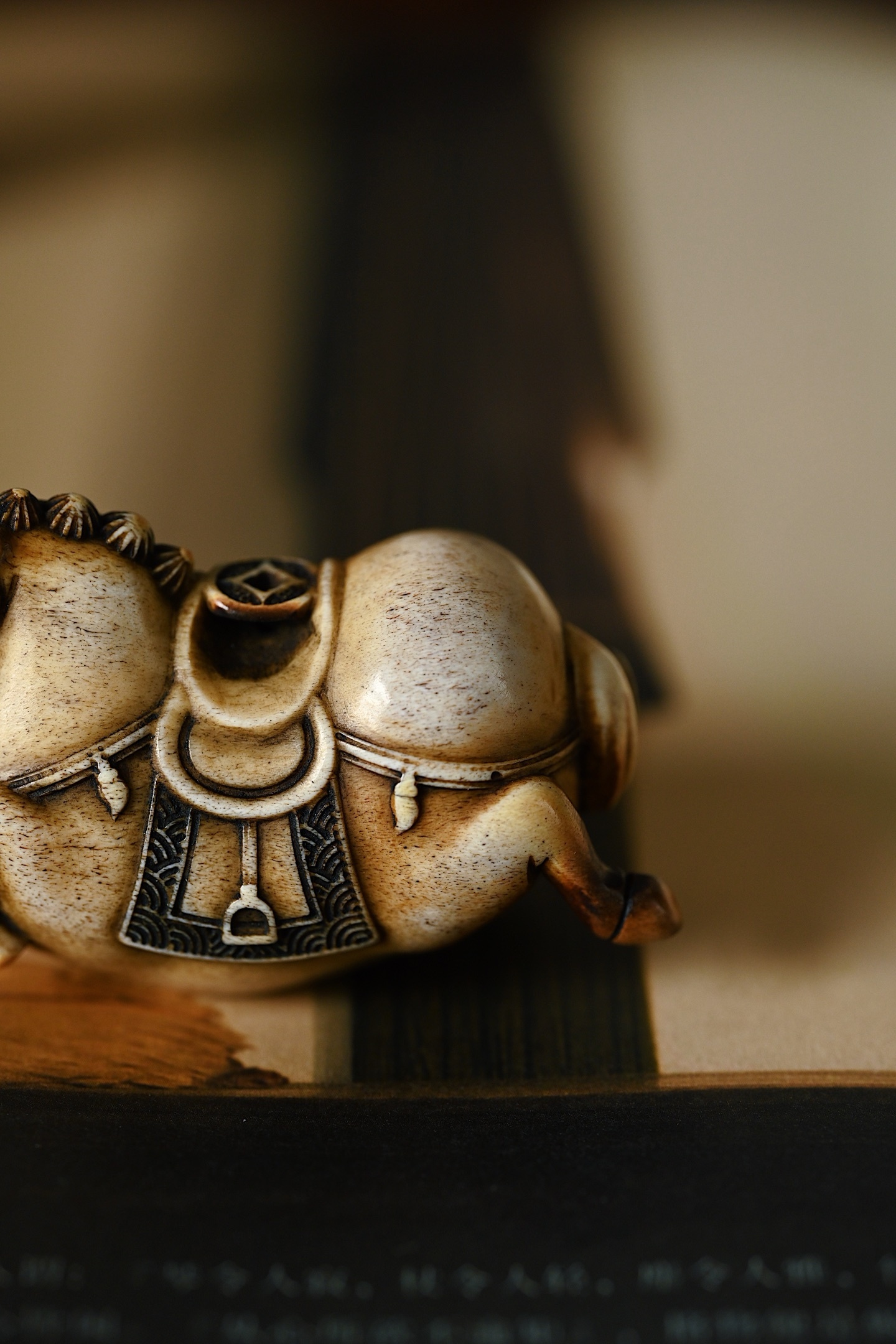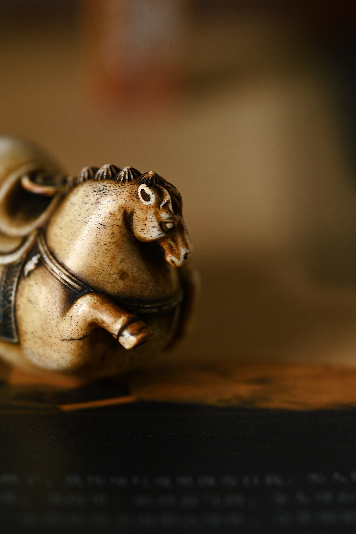 仿古细腻,圆雕饱满结实,塑形写神颇具气势,背驼铜钱,立形达意,祝颂“马上有钱”。