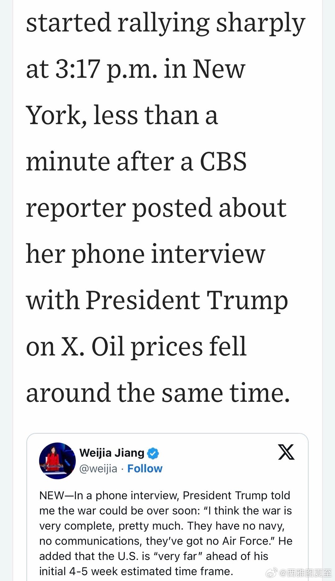 CBS记者:我和总统通电话,他说战争很快就要结束了…伊朗没海军、没空军、没通讯…美军行动进展远超预期,比原计划四到五周快得多