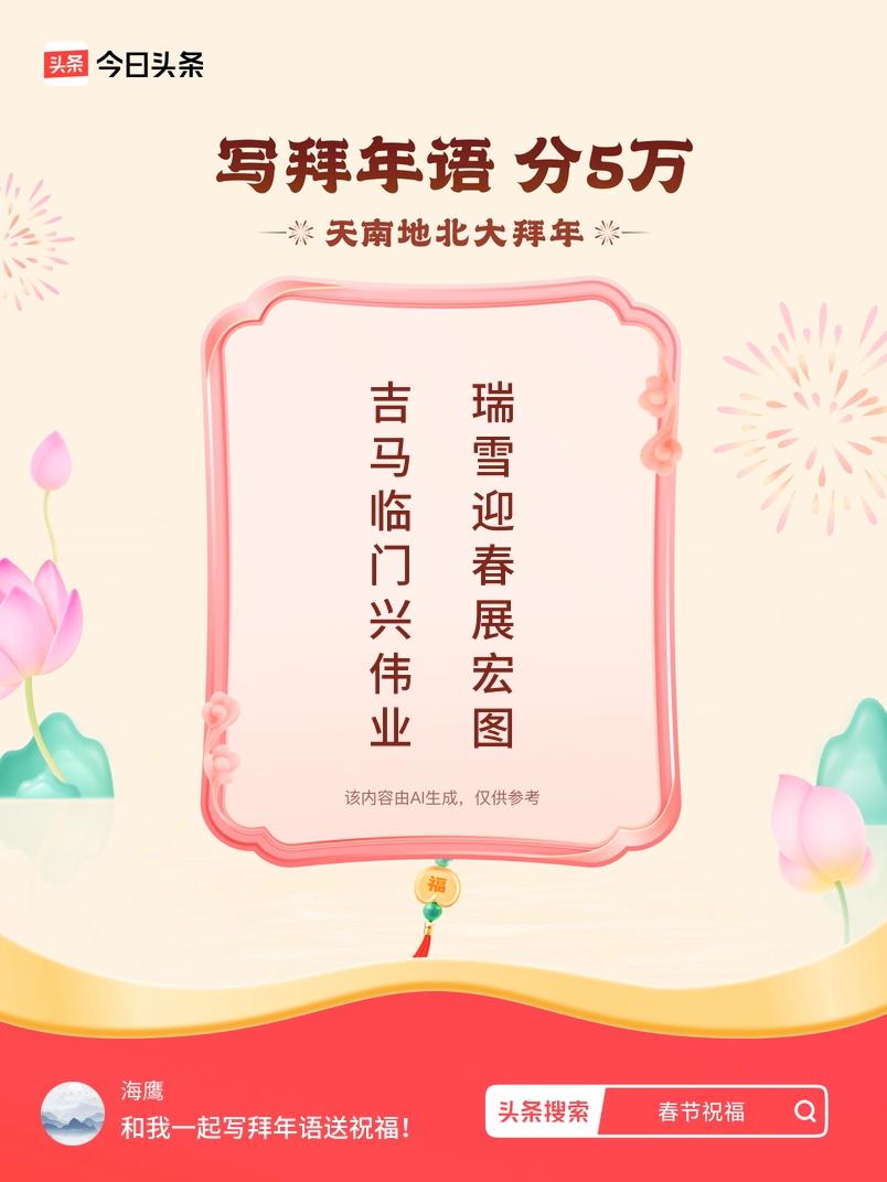 写拜年语送祝福新春拜年送祝福!我的祝福是:“吉马临门兴伟业,瑞雪迎春展宏图”!快来一起写祝福吧戳这里,一起领红包>