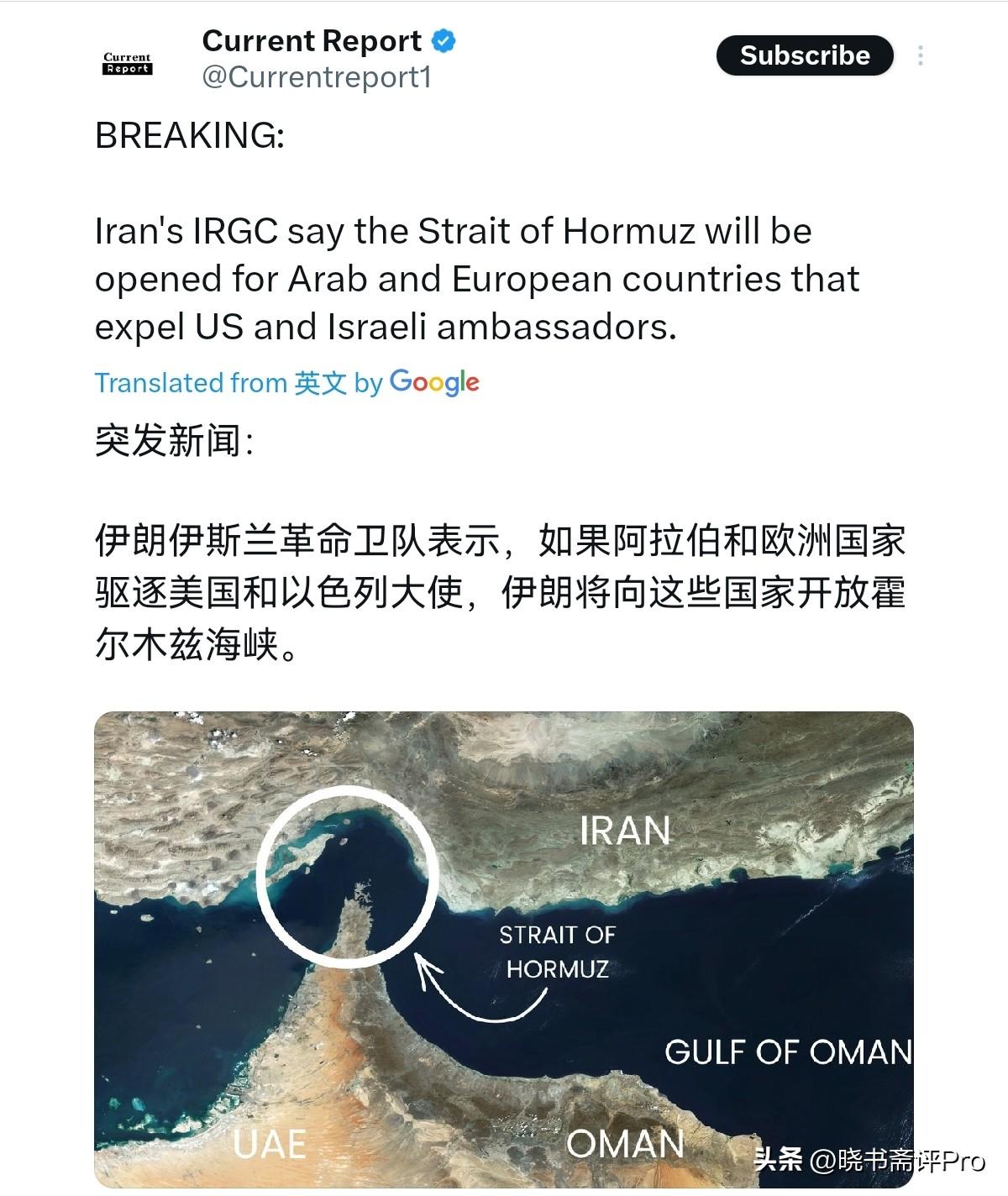 伊朗这招也是蛮狠的!3月10日,伊朗伊斯兰革命卫队表示,霍尔木兹海峡将向驱逐美国和以色列大使的阿拉伯和欧洲国家开放。很显然,伊朗革命卫队的意思很清楚,海湾国家和欧洲国家现在只能在伊朗和美以之间二选一。伊朗这一招可以说,打的很精准。 其一,这可以分化美以与盟友的关系。伊朗此举,打的就是美以两国。就美欧关系而言,如果欧洲国家想要豁免,不说驱逐美国大使,最起码站也要站出来谴责美国,说一些公道话。这招二选一,无疑是在美欧关系之间掺沙子,制造裂痕。而对于中东国家而言,这个时候,恐怕也不得不谴责以色列,以更加公正的立场,对待这一场冲突。否则,这些国家确实会在能源方面遭遇到极大的问题。 其二,对于伊朗自身而言,这既能避免树敌过多,这事实上也是给自己续命。事实上,伊朗封锁霍尔木兹海峡是一记七伤拳。若真的完全封锁,这对于伊朗的也是自断财路,伊朗财政会面临极大的压力。其三,伊朗有条件放行,这可以避免自己成为国际社会的“公敌”,避免全球各国都对伊朗施压,让自身陷入被动境地。很显然,伊朗现在以有条件放行作为筹码,是一个高招,这既能施压,也能自保,更能避免被孤立。接下来就看海湾国家与欧洲如何接招了?