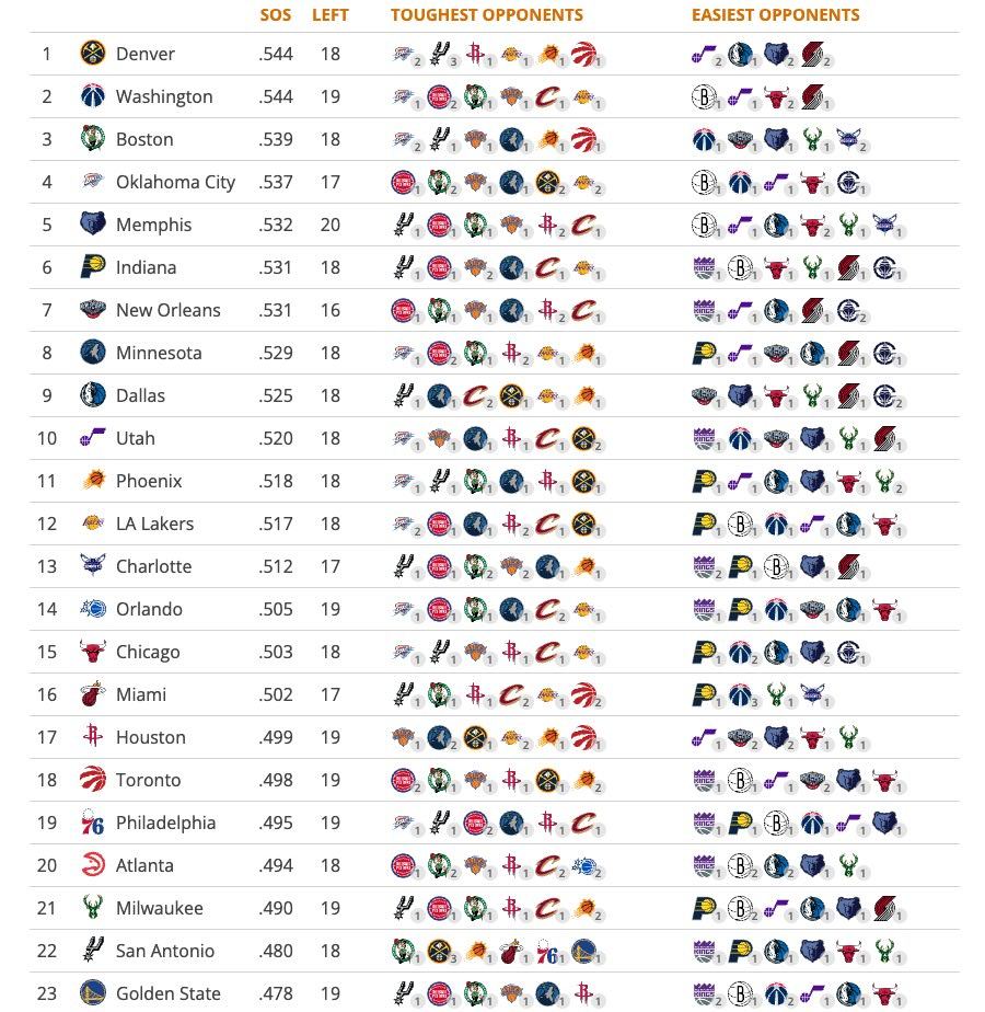 剩余赛程难度,掘金联盟第一,他们不会要往附加赛区域掉吧……新赛季篮不住NBA