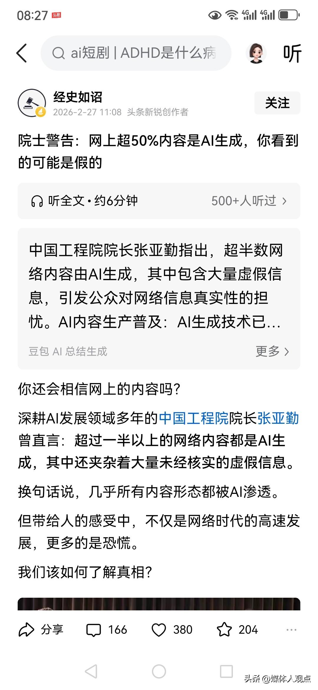 自从有了AI,本记对网上太多的东东不相信了。这句话本记不但在网上说,在现实生活里也这样抱怨。直到看了头条有网民发了这篇文章,我的话不是空穴来风,是有根据的。 今晨(3月10日),在头条浏览,看到了网民发布的这样一篇文章(见截图)文章标题是→院士警告:网上超50%内容是AI生成,你看到的可能是假的,你还会相信网上的内容吗? 文章说,深耕AI发展领域多年的中国工程院院长张亚勤曾直言:超过一半以上的网络内容都是AI生成,其中还夹杂着大量未经核实的虚假信息。 换句话说,几乎所有内容形态都被AI渗透。但带给人的感受中,不仅是网络时代的高速发展,更多的是恐慌…… 以上是本记节选了全文中的一部分,看全文大家可以在头条搜索。 君不见,一张照片通过ai可以激活,通过ai合成,人类可以上天入地,无所不能。甚至自己明明拍的是原创视频,怕网民不信还要标注绝对是真事儿,是自己拍的云云,有点累! 如今,很多网民们把ai合成当乐呵,当新鲜事,利用ai合成让自己过了瘾,可劲的转发。最近,网信部门要求网络平台要严查网民发布AI作品又不标注声明是AI的账号,喜欢发布AI合成的网民你要当心了! ●声明:本小文为纯粹原创,自己写的,不是AI成文[捂脸]你会选择阅读AI生成的新闻吗