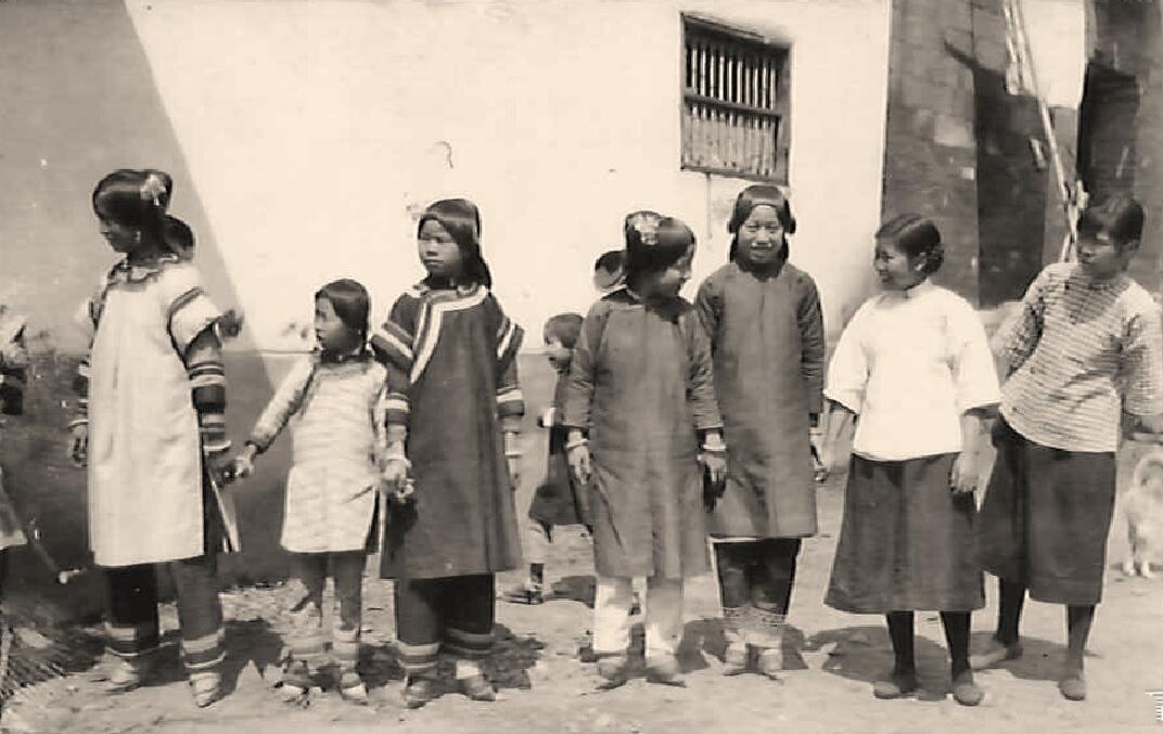 1910年,上海女子学校的女学生。不知是碰巧了还是摄影师刻意为之。画面中的女孩子从左到右完整地反映出了当时女孩子思想观念和服饰的变革。 最左边的三名女子裹着小脚,身上穿的还是清末时期带滚边的传统服饰。中间的两名女子虽然也裹着小脚,但已经不再穿着花里胡哨的袍衣。最右边的两名女子则是天足,上衣为窄身大襟袄,下着裙子,已经完全是现代女性的形象了。所留的发型同样也从繁到简,变得越来越简洁明快。